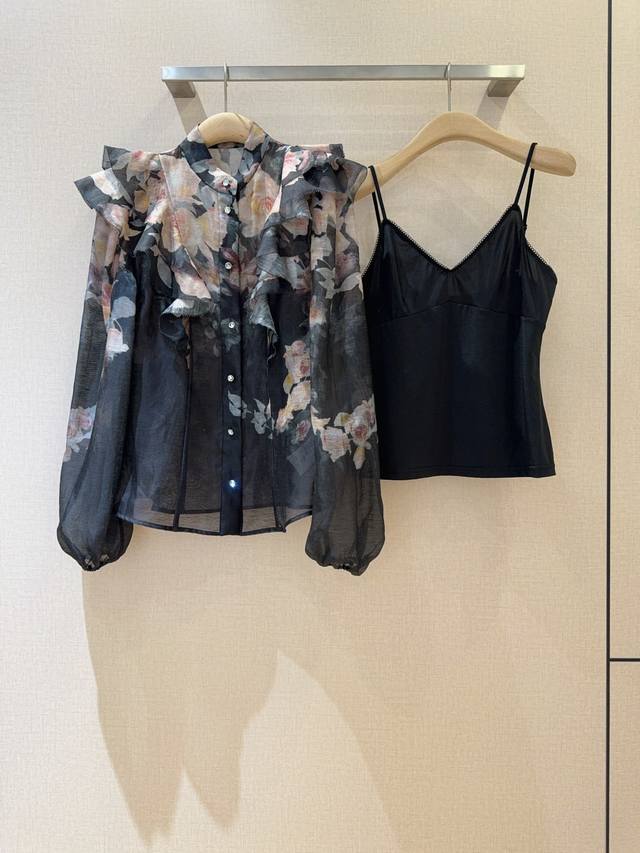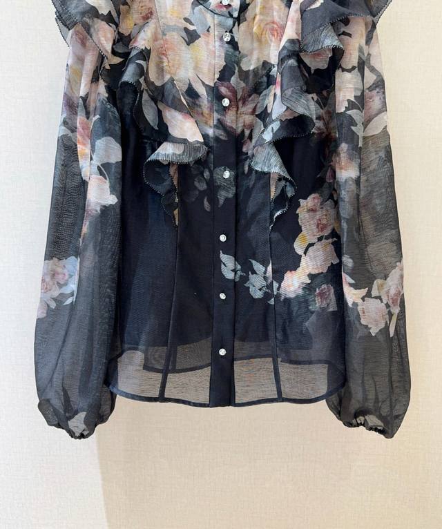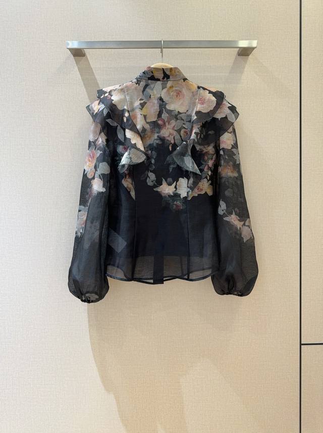 Z*I*M*M New Arrival Recommendation: DDD A black floral print blouse with ruffled shoulder sleeves, made from mulberry silk, linen, and organza fabric. It features a stand-up collar, long sleeves, ruffled shoulders, and button details on the front. The long sleeves with elastic cuffs exude an elegant and charming appeal. DDD Sizes: Smlxl, K241128 DDD
