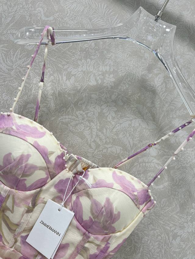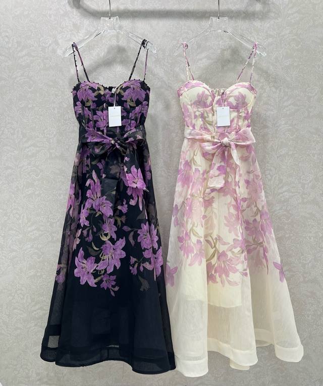 Zimmerm*25 new redbud flower print halter dress with long shoulder straps and rhinestone waistband. Pleated with a striking linen fabric, it features a concealed zipper closure and a cinched waist with allover print. Paired with a fabric belt and an oversized hem, this dress exudes a sophisticated and retro charm. Long, in two colors and four sizes: S, M, L, B,