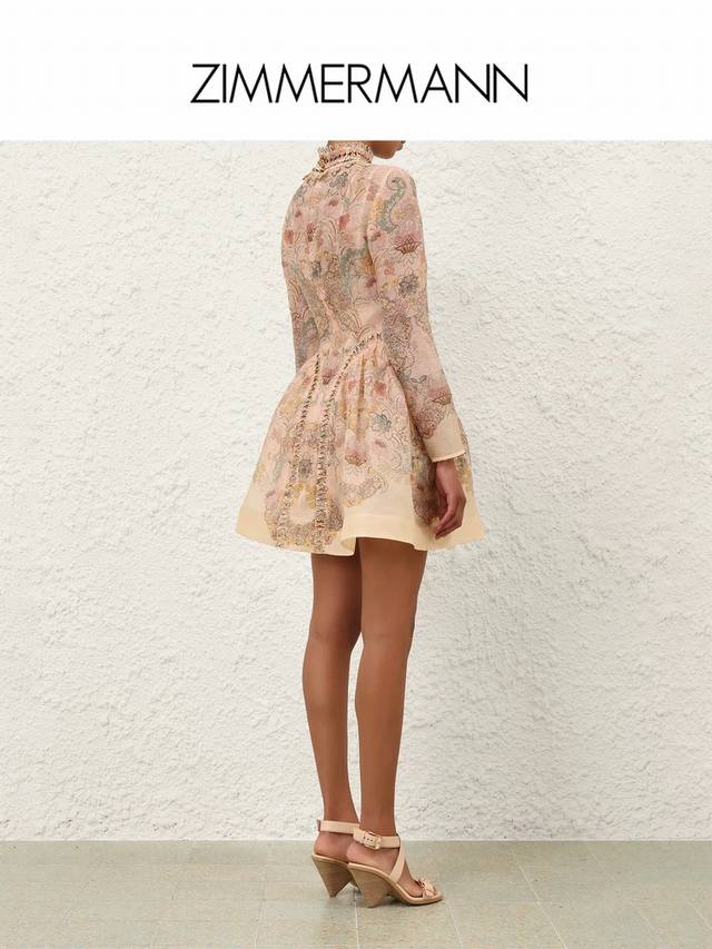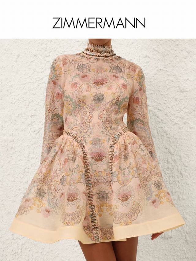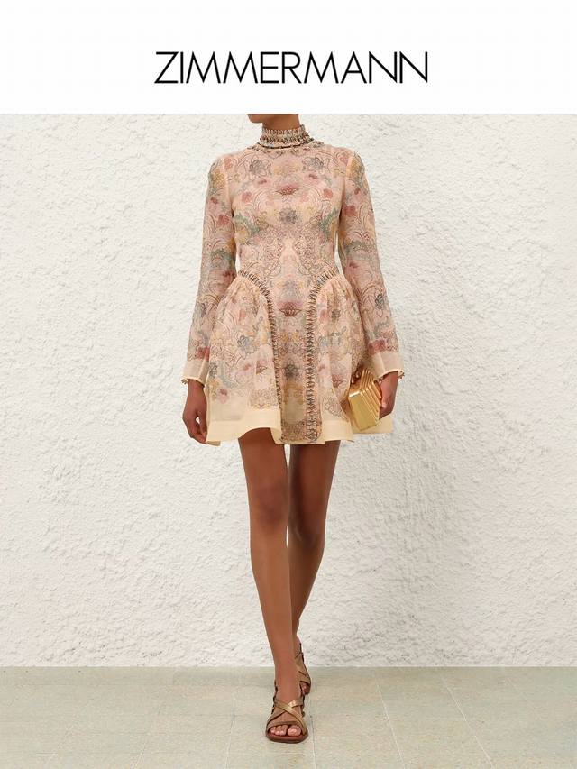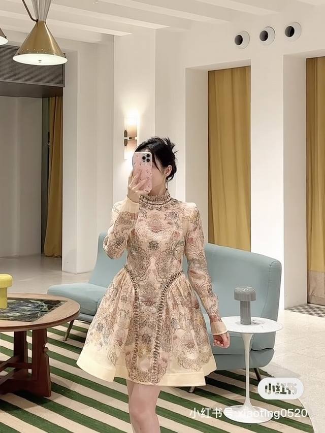 Zimmerma*N, an Australian brand, high-end custom-made heavy-duty embroidered beaded floral print dress with inner mesh lining, full skirt, cinched waist, slimming effect, stand collar, long sleeves, and comes with a waist tie! Sizes 1, 2, 3, 4, S, M, L, XL: Bust 100cm, Waist 86cm, Sleeve Length 62cm, Skirt Length 93cm; Inner layer bust 84cm, super elastic, length 67cm (excluding shoulder straps).