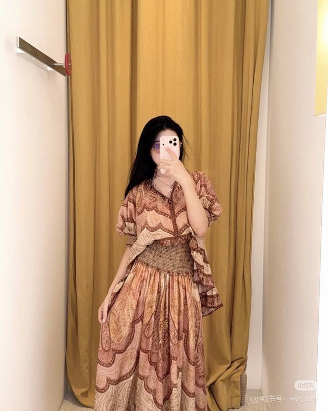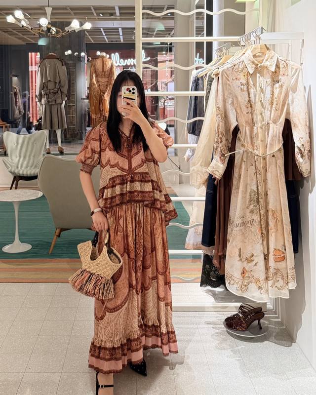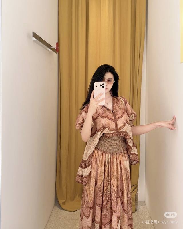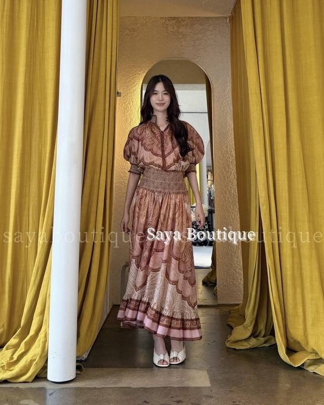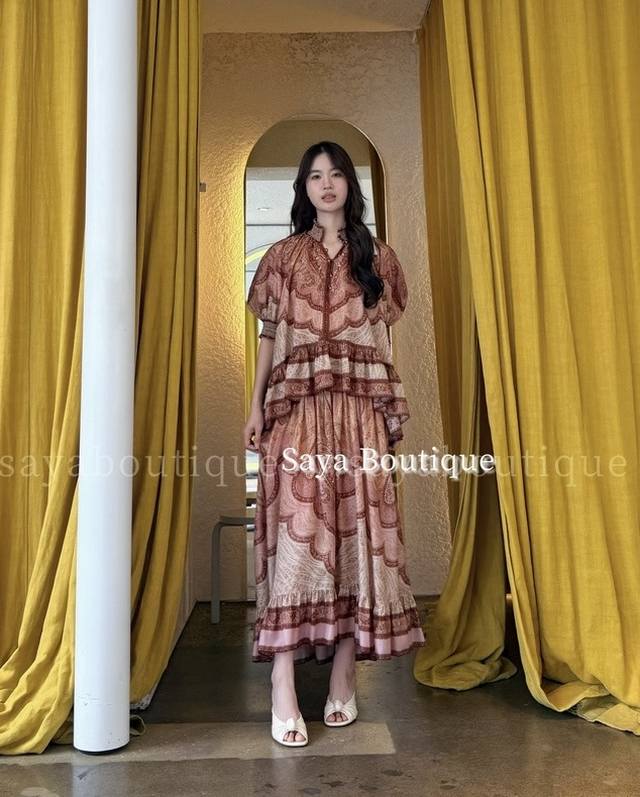 Zimmerma*N, an Australian brand, offers high-end custom-made fashionable retro printed fabrics. This stylish and versatile two-piece set features an exotic resort vibe! It includes a loose-fitting top with a high-waisted, full-hemmed skirt, featuring a shorter front and longer back with ruffled hem and puff sleeves. Sizes 1, 2, 3, 4, S, M, L, XL: Bust 130cm (loose fit), sleeve length 39cm (including shoulder straps), top length 76cm; waist 72cm (elastic), skirt length 102cm. (DDD)