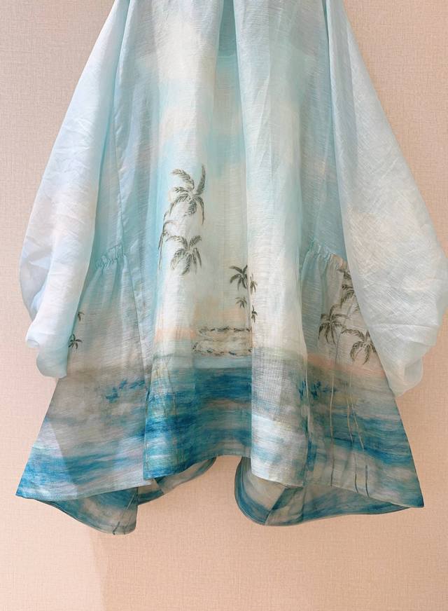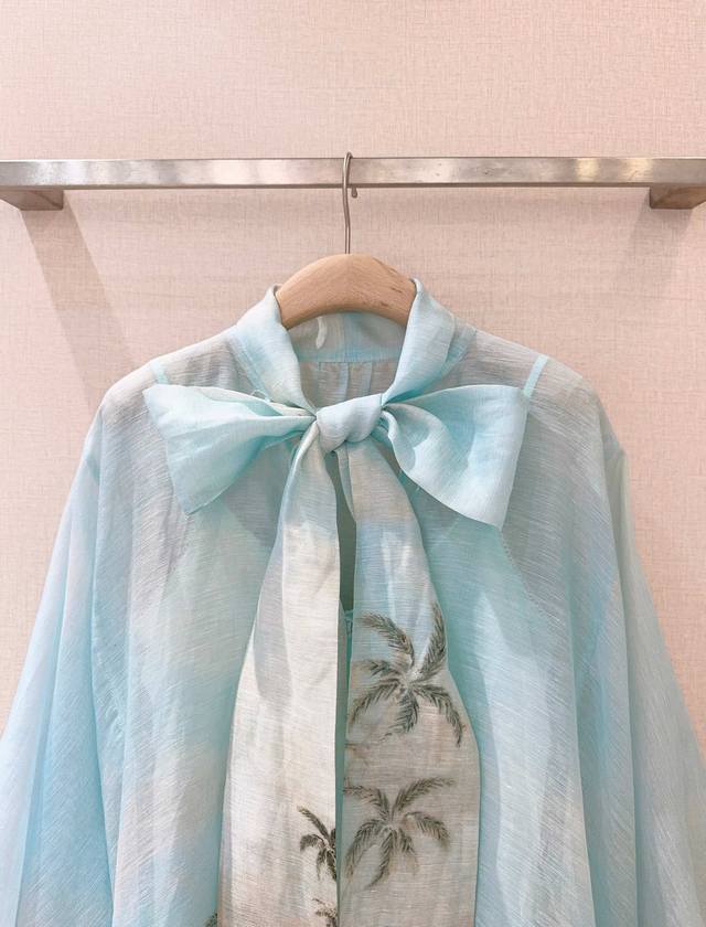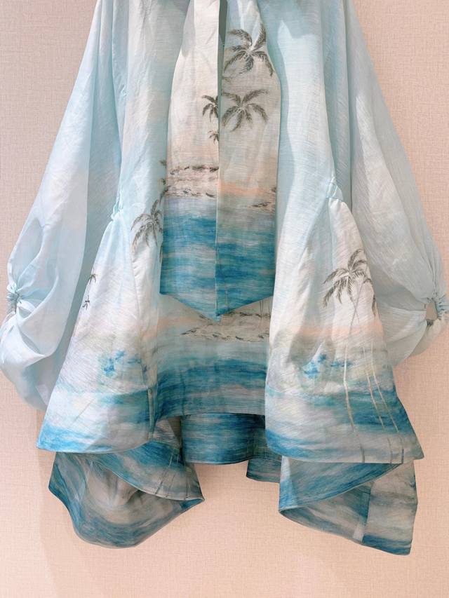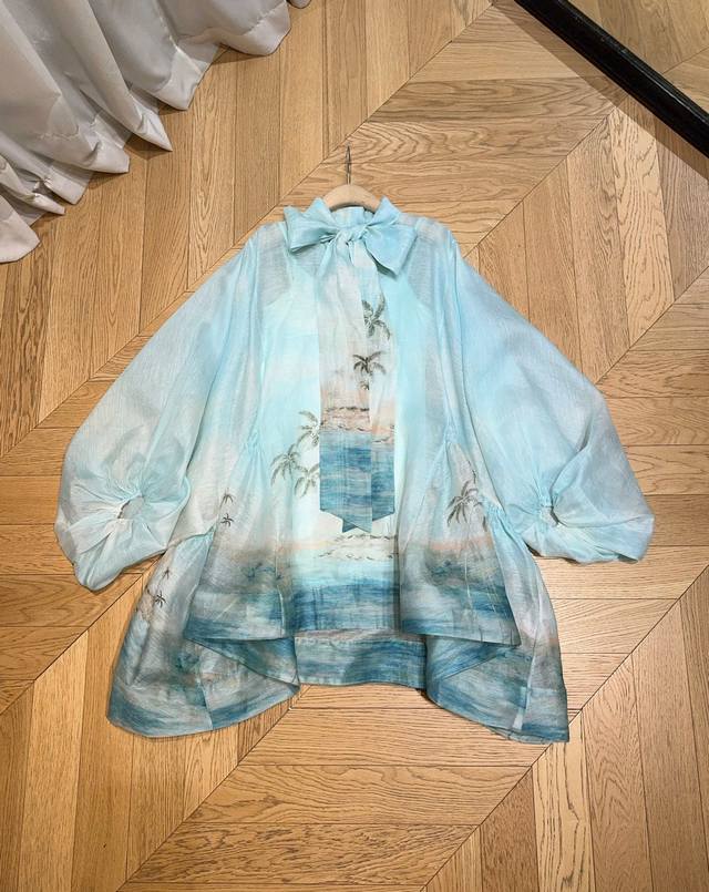 Zimmerm*A*N*N Bow Tie Neck Mini Dress This blue seascape pattern bow tie neck mi