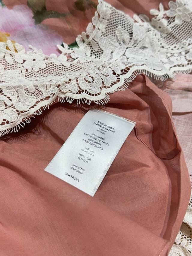 Zimmerm*A*N*N Lace-trimmed Mini Dress DDD This pink watercolor floral print mini dress with lace trim is made of linen and features a deep V-neck and wide lantern sleeves with elasticated cuffs. It has a button-down front and a concealed zipper at the back. The overall lace detailing exudes a gentle and elegant charm. DDD Sizes: Smlxl, K241207 DDD