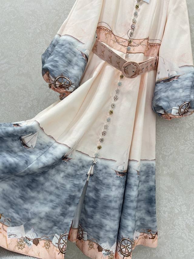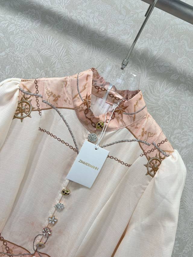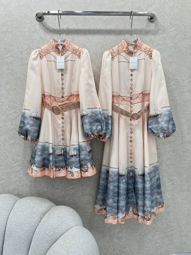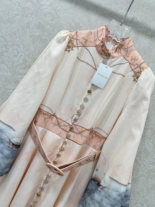 Zimmerman*'s new 25th-century beach resort collection has arrived! A long dress with a small stand-up collar and lantern sleeves. The custom-made front placket features eye-catching hardware. The cuffs are cinched to create puff sleeves. Includes a belt in the fabric's color. The skirt has a generous hem. Made with genuine materials, this is a truly exceptional, fairy-like style with meticulously crafted details, a perfect replica of the original counter model. It's luxurious and stylish, and the fit is perfect for any outfit. Long, one color, four sizes. Smlxlb.