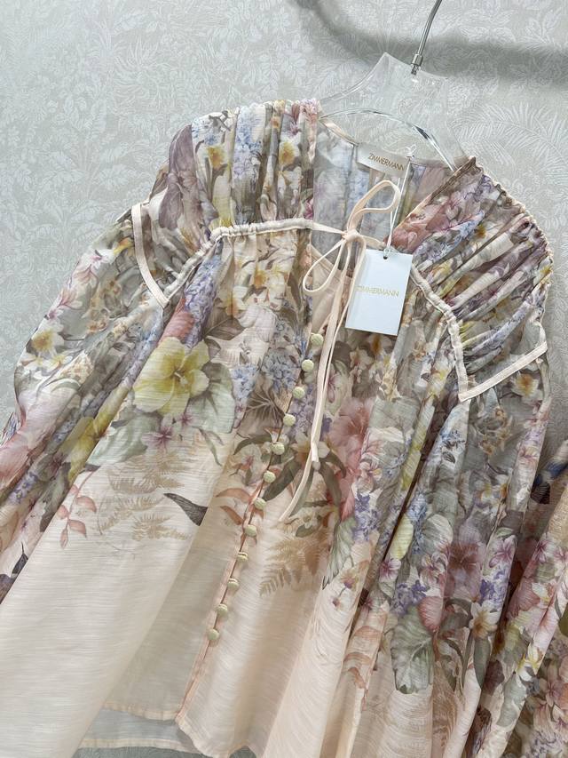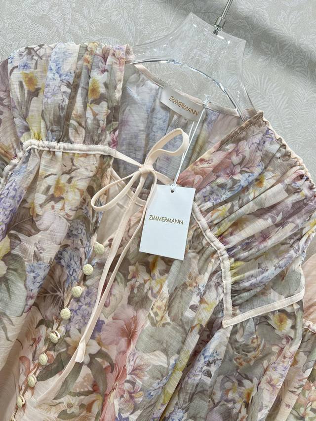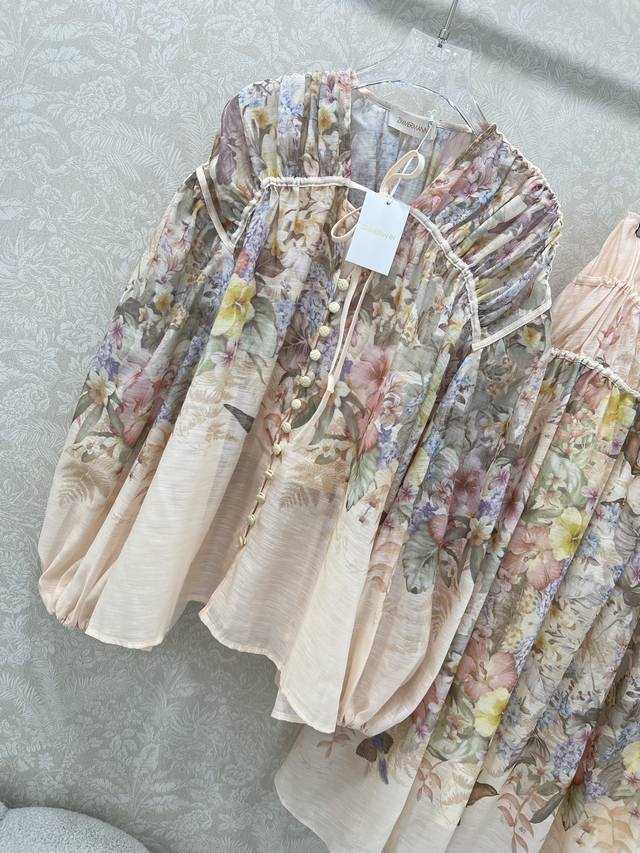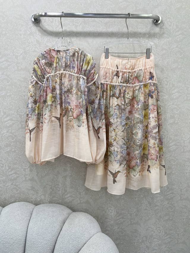 Zimmerman*Zimmerman 25 new suit Pleated drawstring single-breasted loose top + pleated waist high waist oversized skirt The overall print pattern of the suit is of high quality, the top is matched with a small suspender, the front is single-breasted, the cuffs are tightened to become puff sleeves, the skirt is oversized, the material is full of sincerity, the super enviable model is super high-altitude, the details are heavy, and the counter model is full of high-end feeling. The version is super good and it shows temperament when it is matched casually. Single color 4 yards Smlxlb.