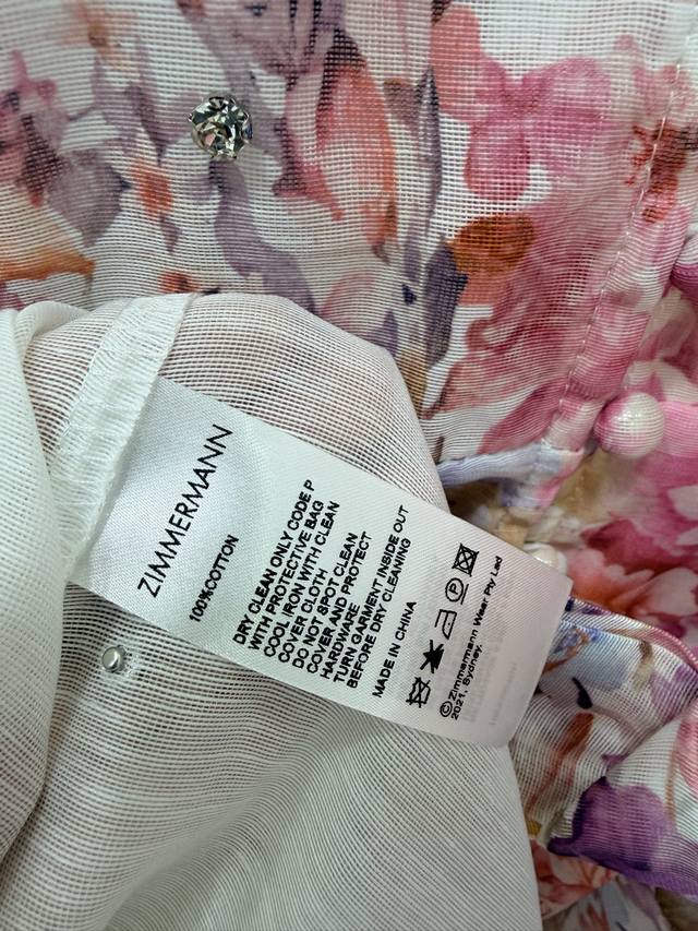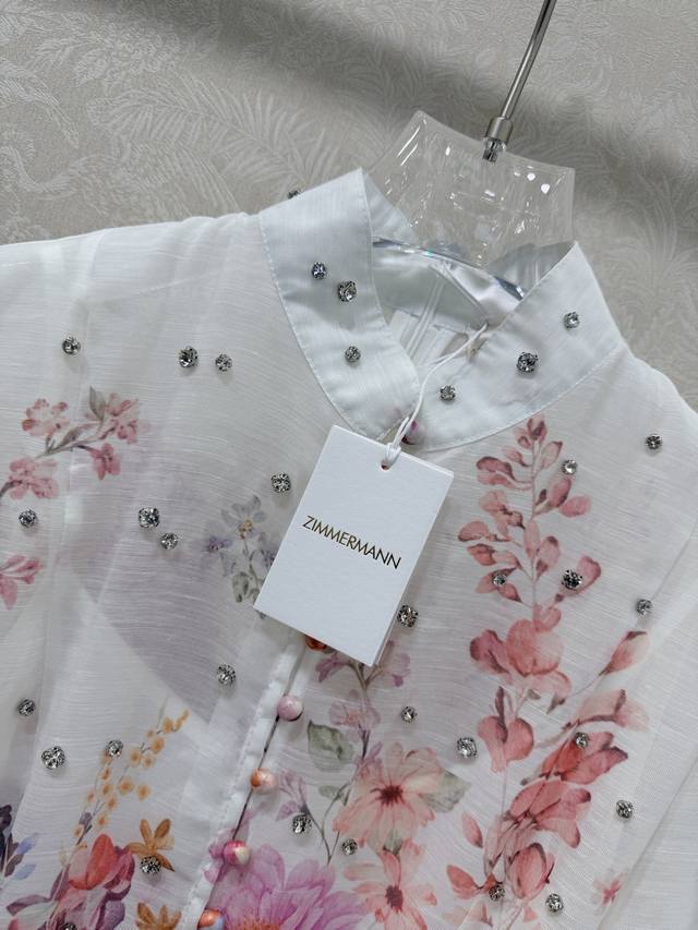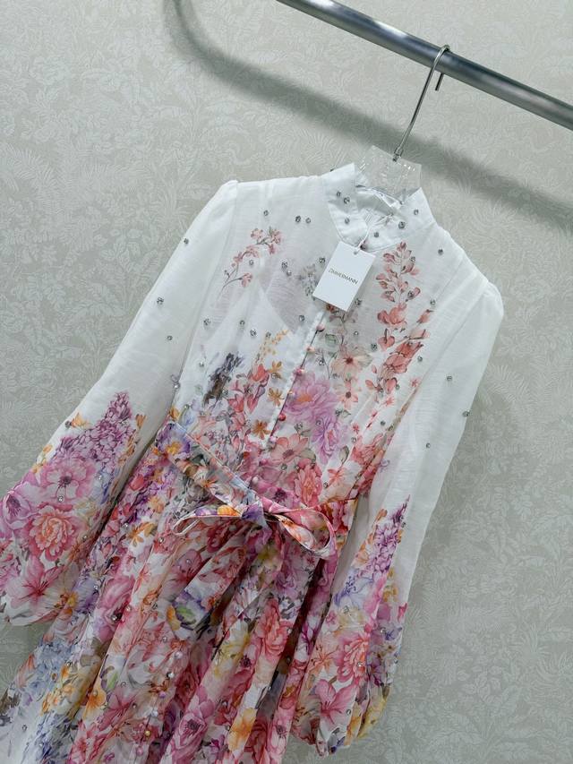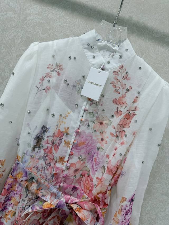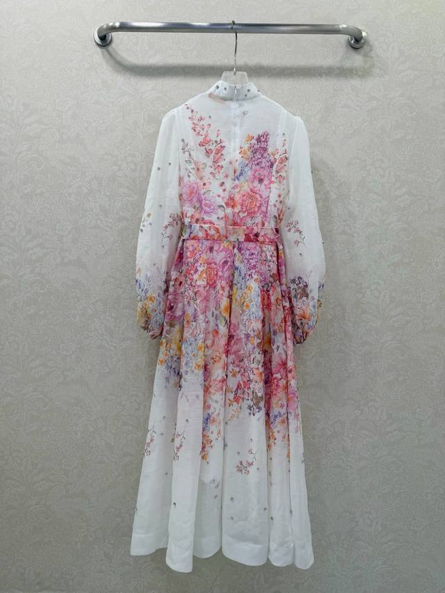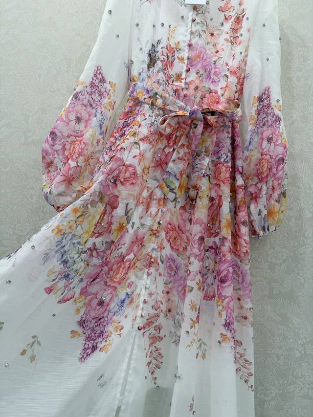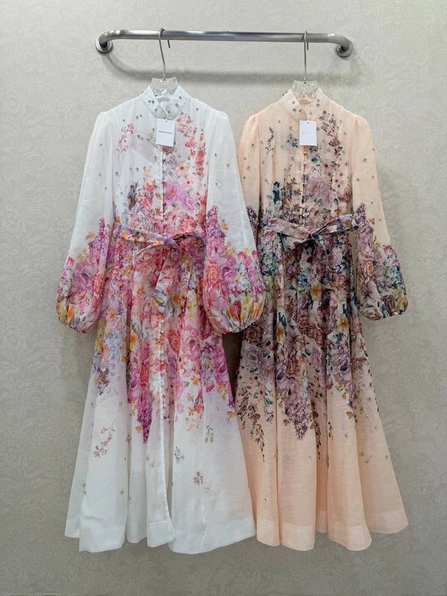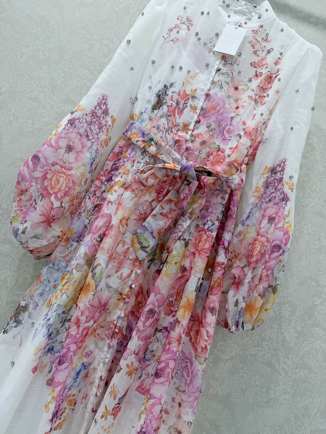 Zimmerman*Zimmerman 26 Early Spring New Floral Series Long Dress with Small Stand Collar and Lantern Sleeves. All-over beaded front, single-breasted fabric button closure, eye-catching floral details on the cuffs. The cuffs are fitted to create puff sleeves. Comes with a fabric belt in the same color. The dress has a very large hem. Made with high-quality materials, this is an incredibly elegant and fairy-like dress with meticulous details, perfectly replicating the boutique style. The fit is perfect, and it looks great with any outfit. Long dress, 2 colors, 4 sizes (S, M, L, X, B, D).