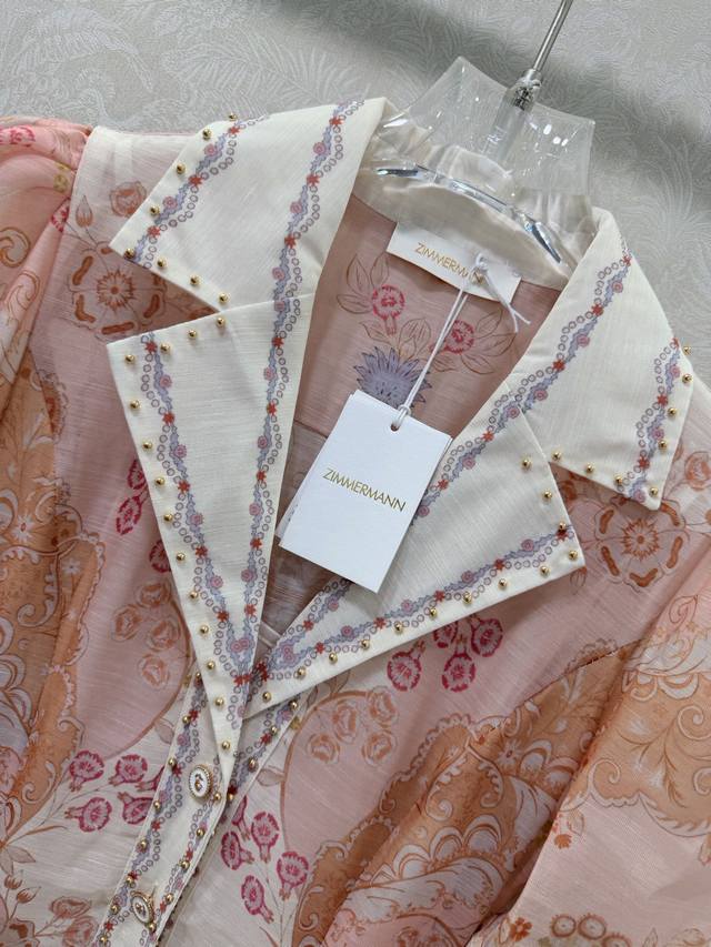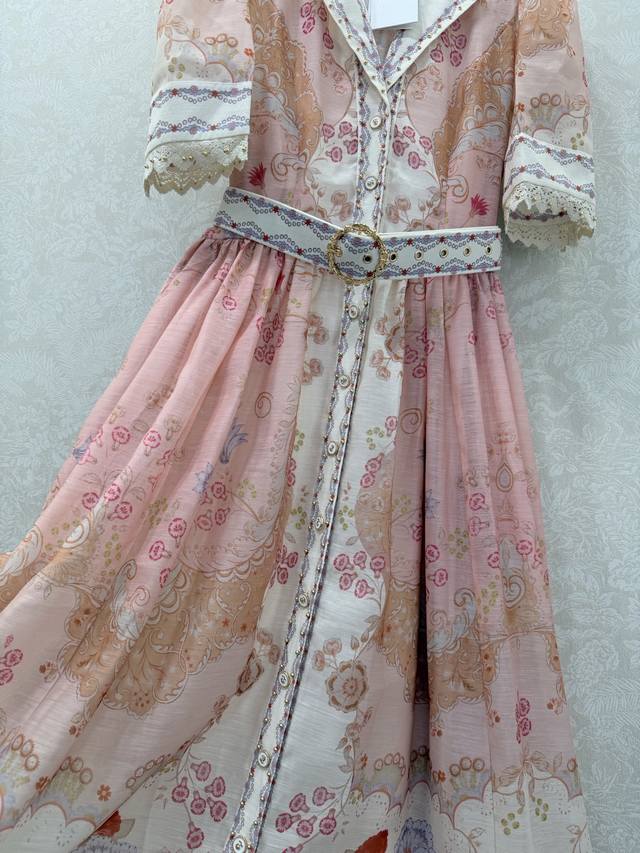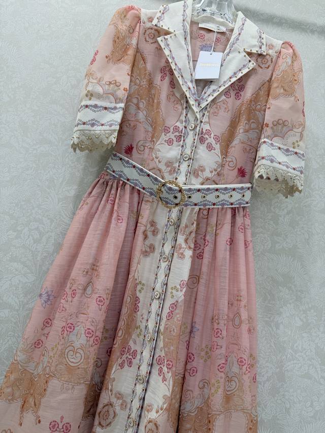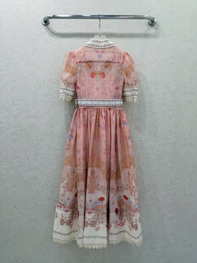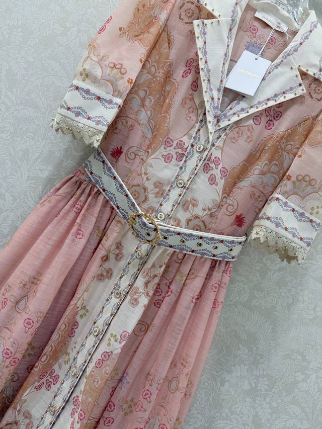 Zimmerman*Zimmerman 26 Early Spring New Two-Piece Dress, Collared Puff Short Sleeve Button-Down Front Lantern Short Dress with Custom Belt. The bodice features a button placket and lantern sleeves with elastic cuffs, adorned with pink floral patterns. The loose, wide skirt hem exudes a vibrant and fashionable feel. Long, 2 colors, 4 sizes: Smlxlb DDD Ddd