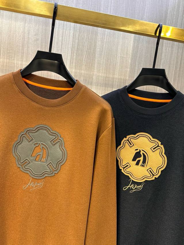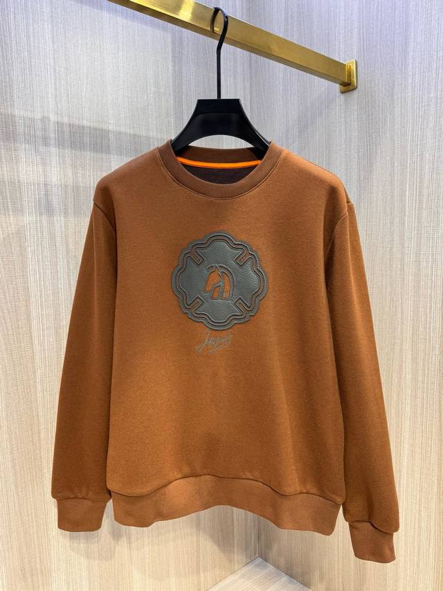 Aima's latest 2025 Fall/Winter men's round-neck cashmere sweatshirt with horsehead logo. This classic pullover features the iconic horsehead leather logo on the chest. Crafted from imported washed lambskin using high-end laser embroidery, it's incredibly soft and delicate. It's already pre-washed, so you can rest assured it's ready to go. It's elegant, refined, and layered, with the freehand embroidered logo for a highly distinctive, upscale look. The slightly loose fit makes it a versatile piece, effortlessly projecting a unique sense of sophistication and powerful presence. Wear it as a layered outerwear piece in spring and autumn, or layer it with coats and down jackets in winter. Whether paired with a stylish urban elite or a stylish down jacket, it creates a stylish and refined look.