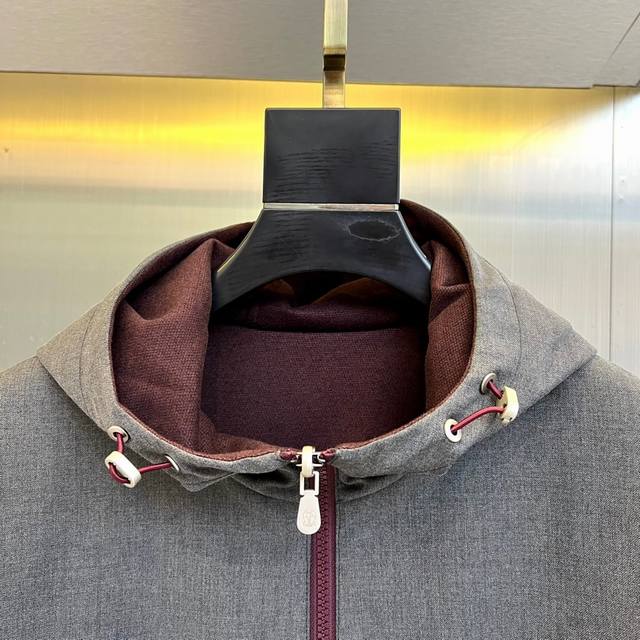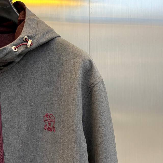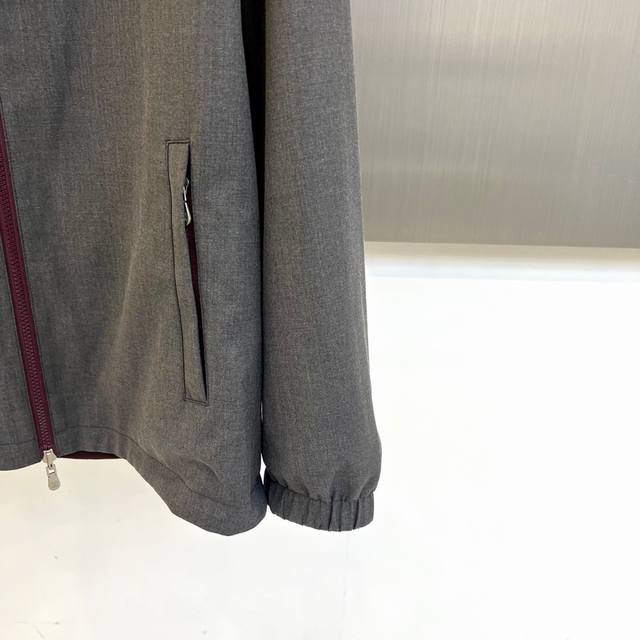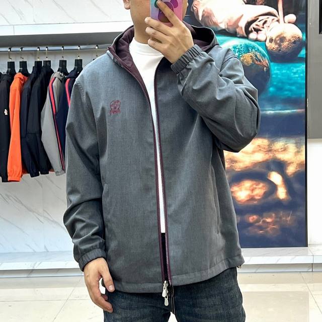 embody the brand's Italian minimalist aesthetic. The gray version features a hood with a colorful embroidered logo on the left chest, vertical pockets, and elastic cuffs. The dark blue version, accented with a red embroidered logo, features a zippered pocket and an adjustable drawstring hood. Both jackets are reversible, with a through-the-way silver zipper allowing for reverse-conversion. One side exudes urban simplicity, while the other showcases functional athleticism.
