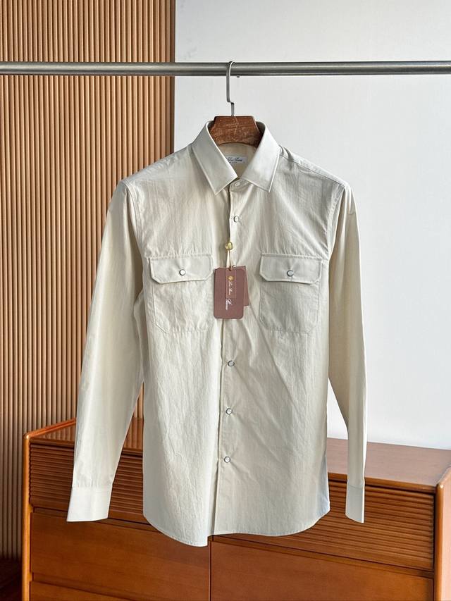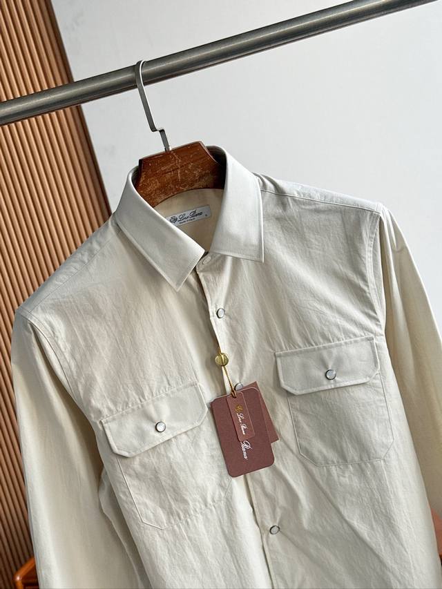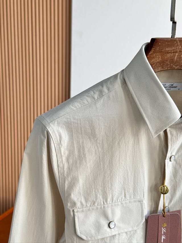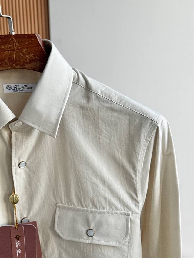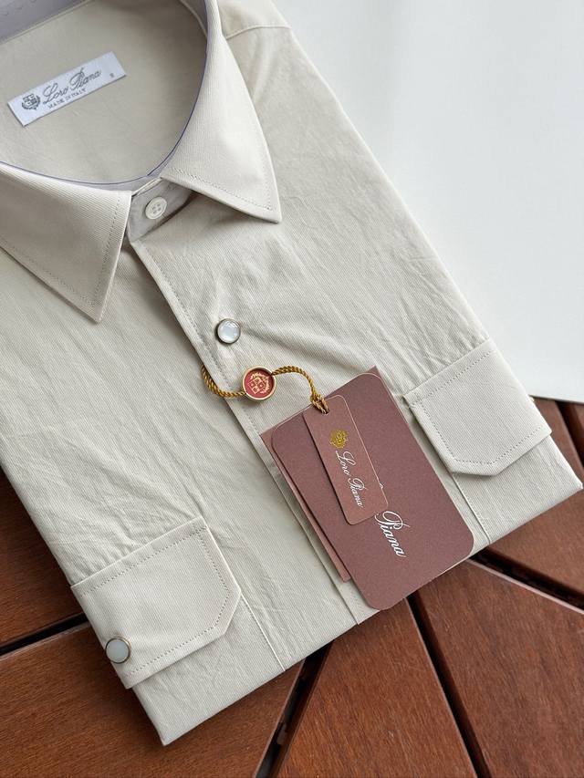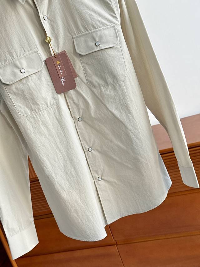 Beige details, DDD Loro piana, 2025Fw Autumn/Winter New DDD Classic Shirt, always looks good. Timeless. Lp shirts emphasize quality, fit, and workmanship, with many best-selling styles every year. DDD meticulously selects and strictly controls fabrics, resulting in this natural linen and cashmere fabric. It also has a slight stretch and is treated with liquid ammonia for wrinkle-free wear. You won't find this high-end quality elsewhere; there are many similar styles, but none match this level of fabric and workmanship. The feel and texture are first-class, comfortable against the skin, breathable and soft. The classic double-pocket flap style, paired with pearlescent white cotton and antique bronze snap buttons, makes it a great choice for wearing alone or as an inner layer. Both the overall effect and the details showcase high-end craftsmanship. Available in three colors: pearl white, beige, and black, S/ml/XL/XXL 020 DDD