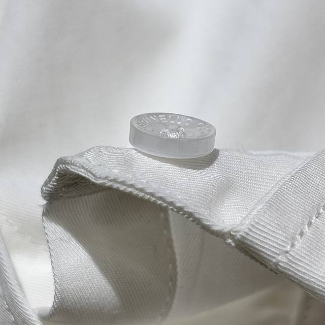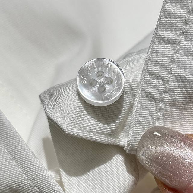 Brand-stamped mother-of-pearl button closure at the placket!!