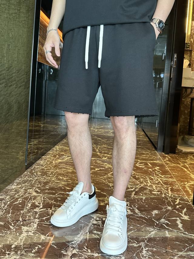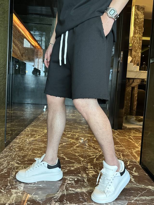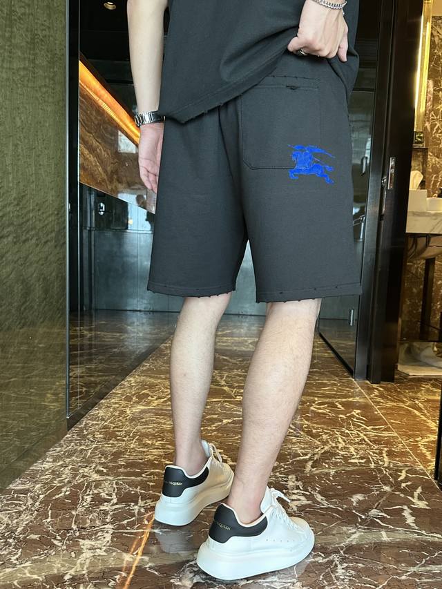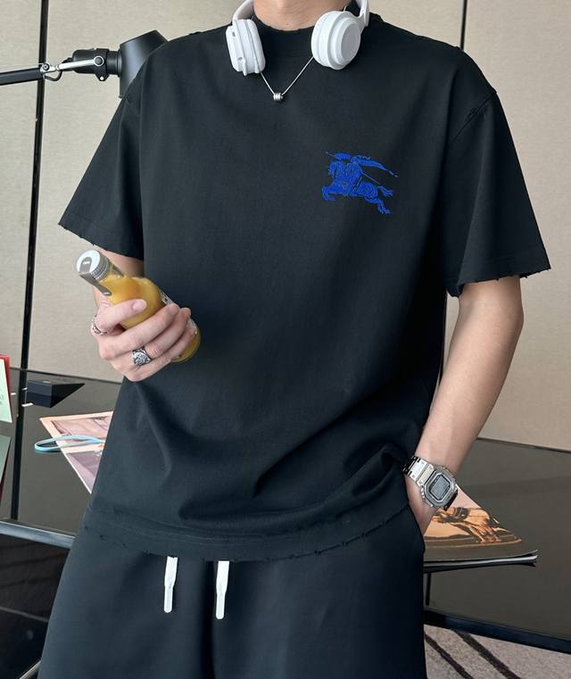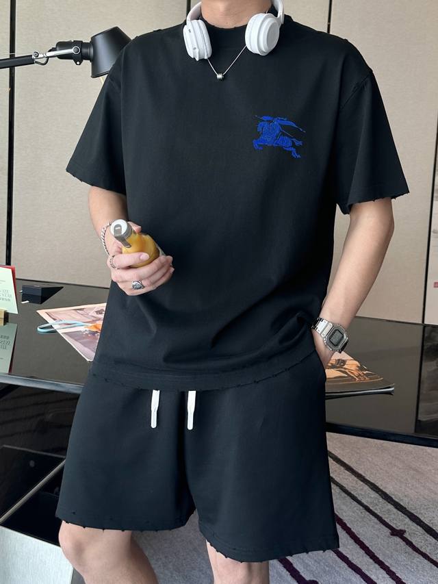 bur's new 2025 Spring/Summer casual suit exudes understated luxury. Both the T-shirt and shorts are crafted in classic black, creating a calm and elegant look. The blue brand riding logo embroidery on the chest and sides of the pants is a finishing touch, exquisite and eye-catching, understatedly highlighting the brand's style. The suit's simple silhouette is comfortable and effortless to wear. Whether for daily travel or casual gatherings, it easily showcases unique style.