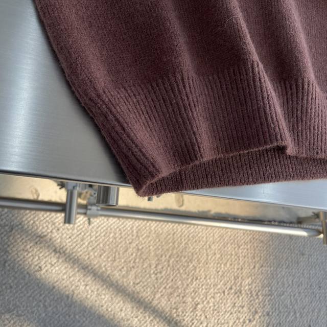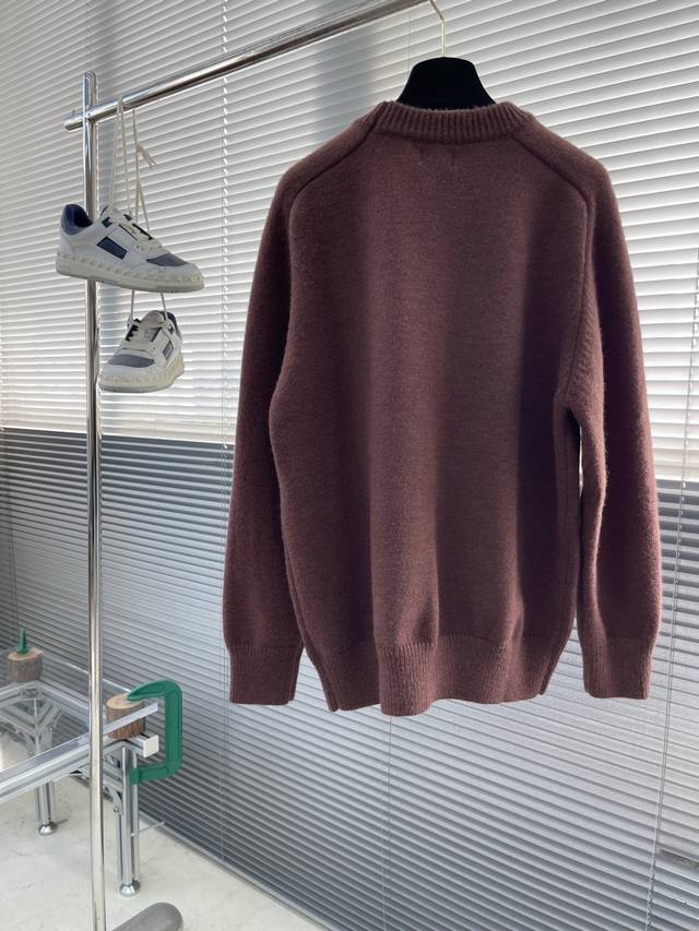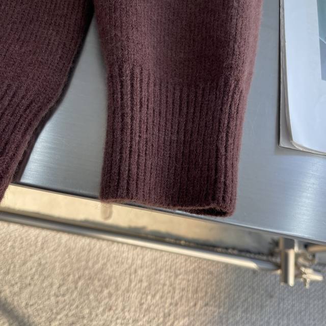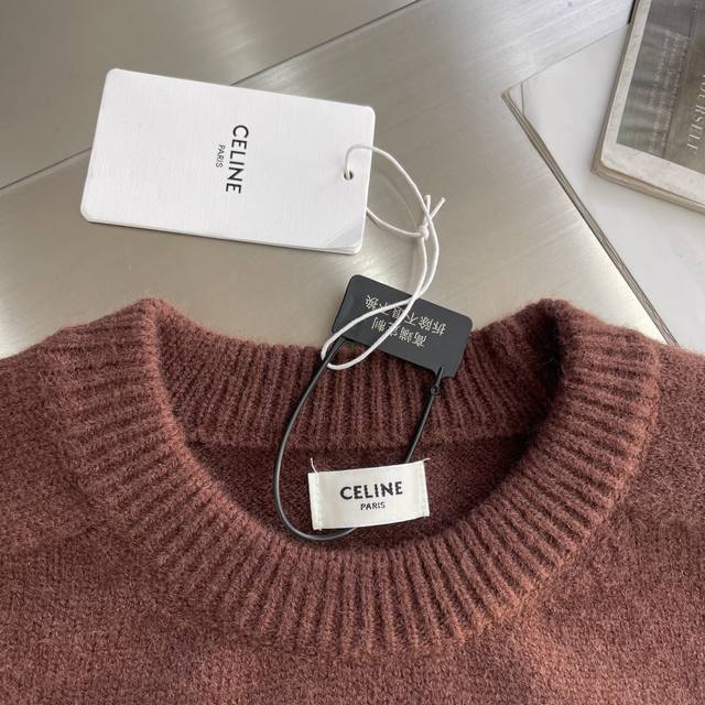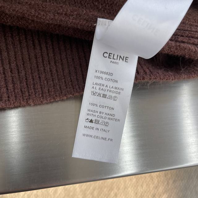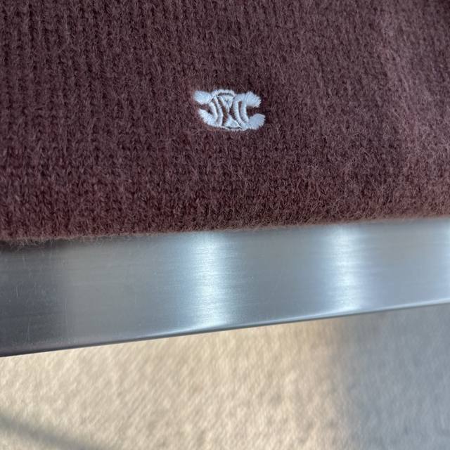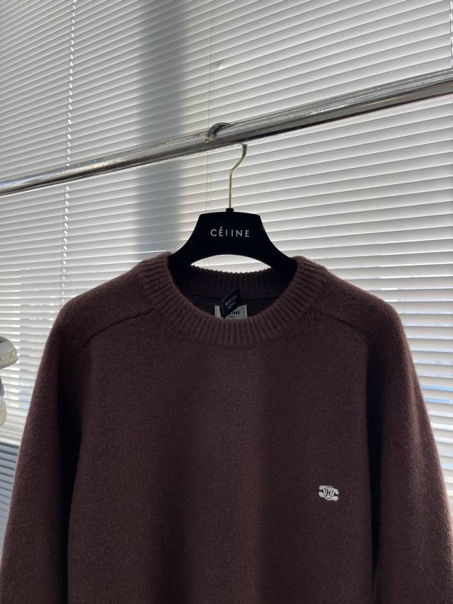 Celin Arc de Triomphe Embroidered Logo Knit Sweater (DDD) is made of 35% wool, 15% cashmere, and 50% cotton yarn. The fabric is soft and has a structured fit, maintaining its shape even after long wear. The embroidery is 3D, featuring the Arc de Triomphe embroidered logo on the chest. It is machine-knitted with a 7-needle pattern and high-density, thick stitches for warmth. Post-processing includes color fixing, pattern maintenance, and removal of wool impurities. Sizes: S, M, L, XL. Chest circumference: 108cm.