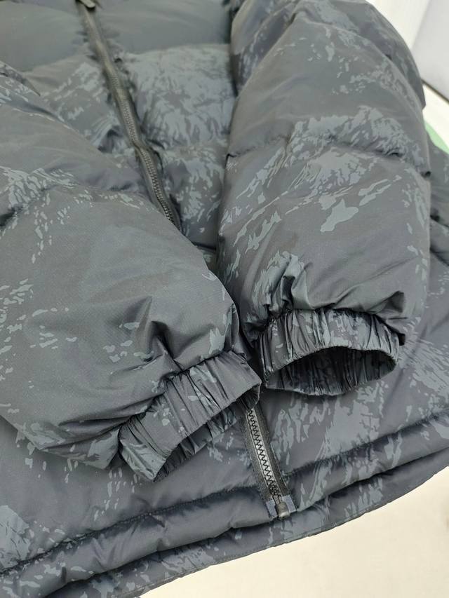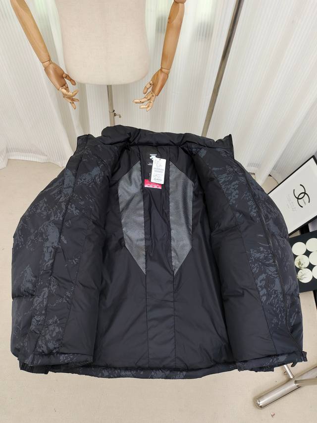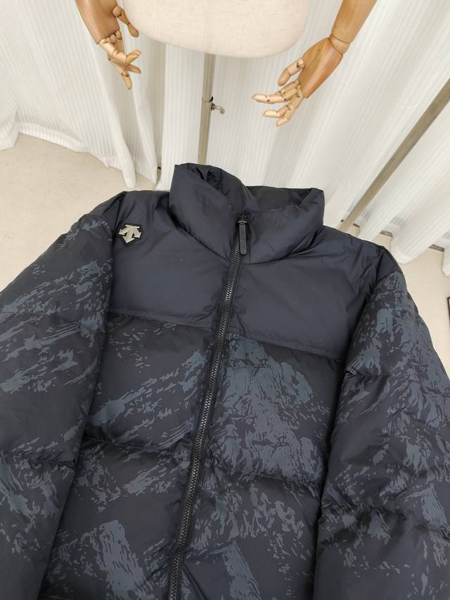 Descente Audi classic snow mountain print short down jacket. The different colors blend together beautifully, adding a touch of street style. Filled entirely with white duck down, it's both warm and lightweight. The short jacket's shape is also strikingly proportional, making it the perfect winter piece that combines ski elements with street style. Classic black and white colorway.