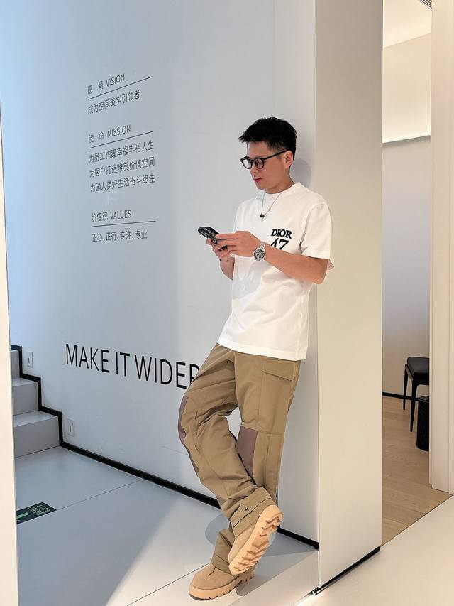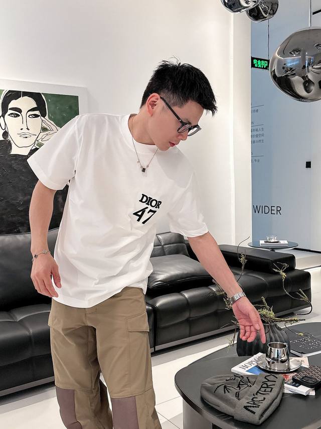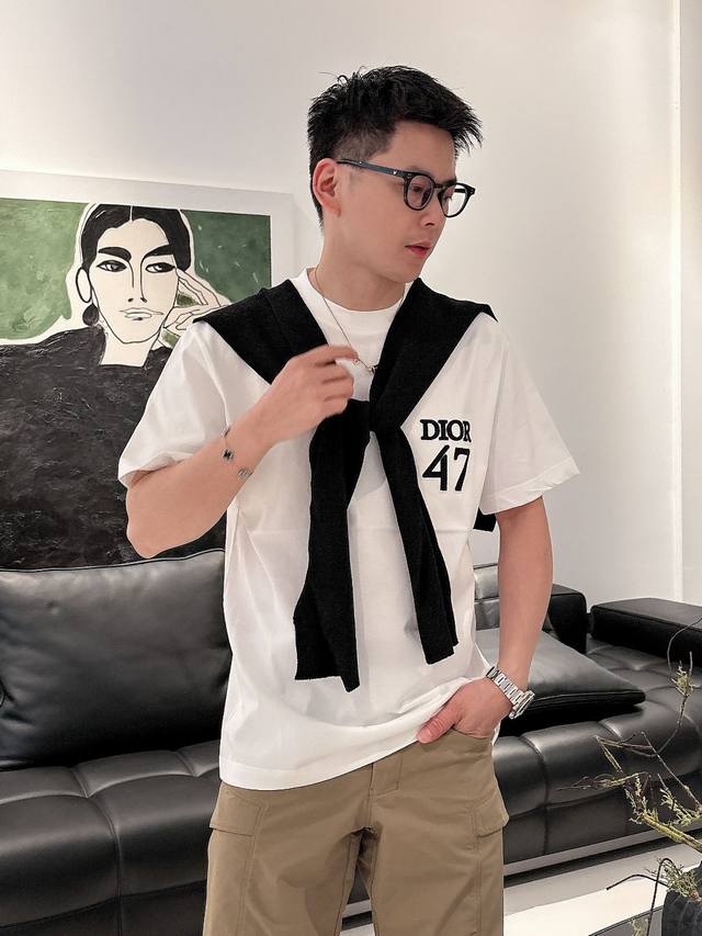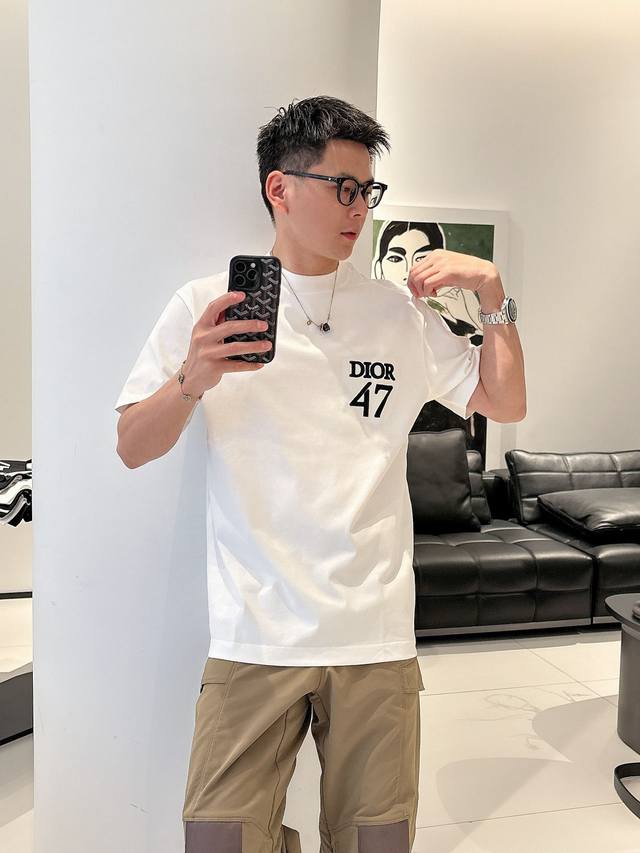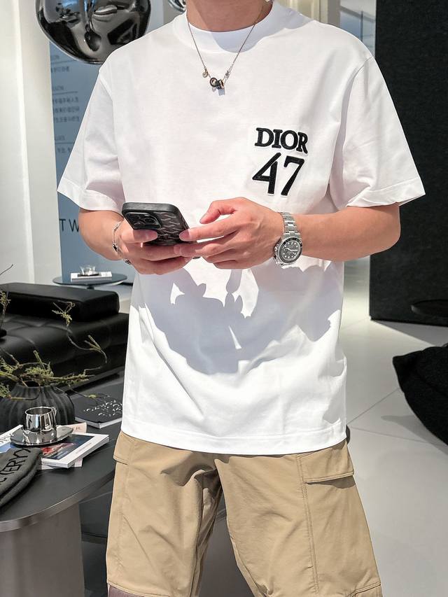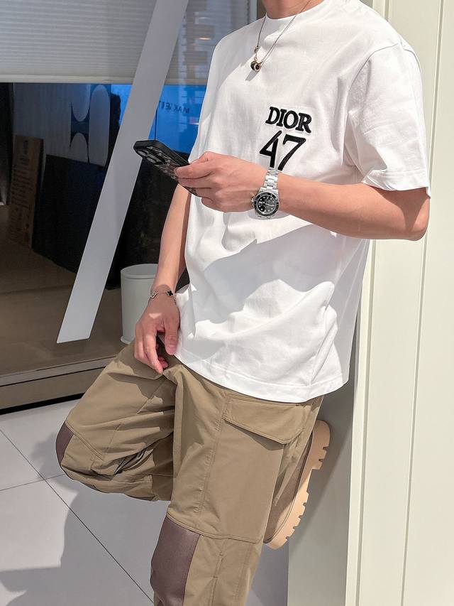 Dio* 2025 Spring/Summer new cotton round neck short-sleeved T-shirt with heavy chest embroidery. Top-grade mercerized cotton fabric. Customized standard fit. Available in black and white. Unisex. Sizes: S, M, L, Xl, Xxl,