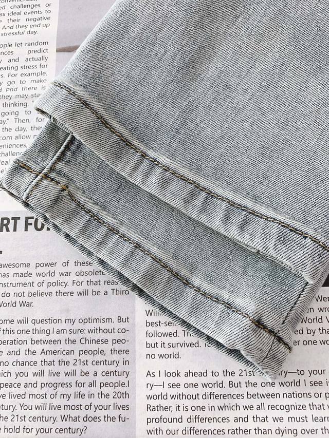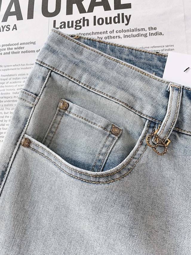 , features high-fashion, heavy-wash jeans. The
