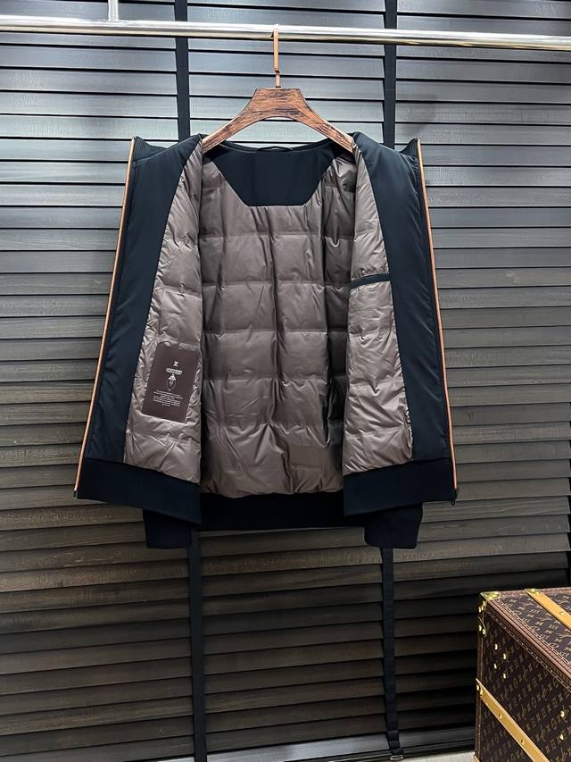 . Lined with 80g-90g white duck down, this lightweight and stylish jacket is designed to be effortlessly stylish without bulk. It features two 3D brown stripes on the left front. This quintessential Italian fashion piece is sourced from trading companies and features meticulous fabric selection and craftsmanship, perfectly embodying the Z family aesthetic. It offers understated luxury, elegance, and sophistication. Every detail showcases the brand's premium aesthetic. This jacket perfectly embodies Italian minimalism, sophistication, and outdoor functionality. It's both formal and playful, and boasts a stylish silhouette. This treasured piece of functional gear combines fashion and design, creating a unique look. Its modified aviator silhouette and classic stand-up collar create a retro, youthful, and stylish look.