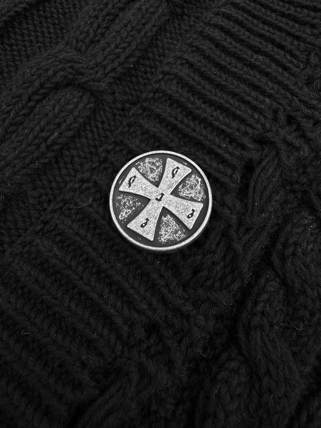 Enfants Riches Deprimes Cable Knit Cardigan Sweater. Made of custom-woven, high-density cotton wool, this sweater boasts exceptional texture and comfort next to the skin. A deep black base creates a calm and elegant look, laid out with a sense of absolute symmetry. Five bronze buttons on the front panel are arranged vertically along the placket, creating a visually slimming effect. The back panel is deliberately ripped in an irregular pattern, while the front panel's regularity is emphasized by asymmetrical holes scattered like star tracks. This imaginative and imaginative approach embodies contemporary design's rebellion against perfectionism, highlighting the brand's "melancholic rich second generation" philosophy. A restrained sense of ritual is evident, and less is more. Technique 1: Rope Carving: This advanced knitting technique combines three-dimensional twisting with asymmetrical hollowing techniques. This technique uses needlework to create graphic holes of varying sizes, and the curvature of the spiral holes at each knot is manually fine-tuned. Technique 2: The three-dimensional cable knit is made by cleverly shifting and interweaving the coils to cross-shift the adjacent coils to form a twisted effect of the cable knit. The lines are smooth and regular. It is time-consuming and labor-intensive.