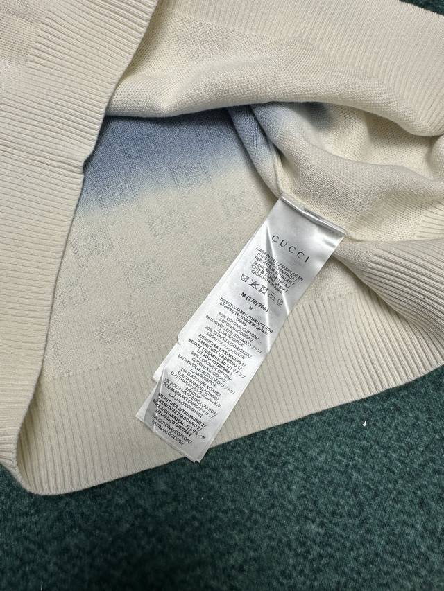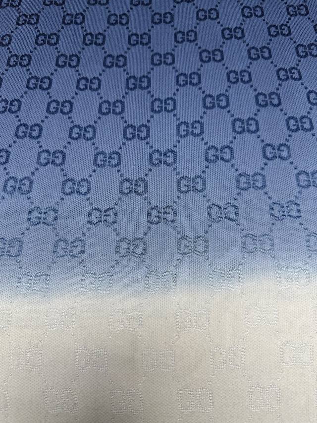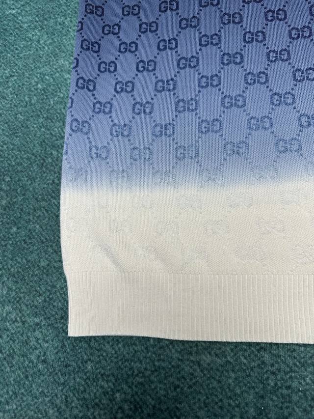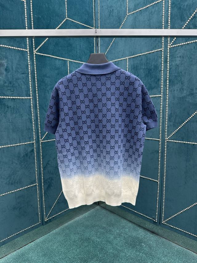 G brand 25Ss new collared T-shirt crafted from Gg knitted cotton jacquard fabric, featuring a meticulously crafted gradient from deep blue to white. Sizes: S, M, L, XL.