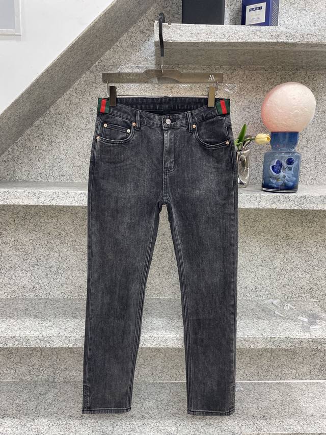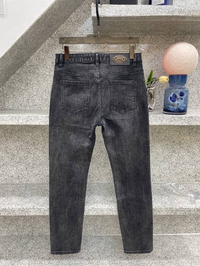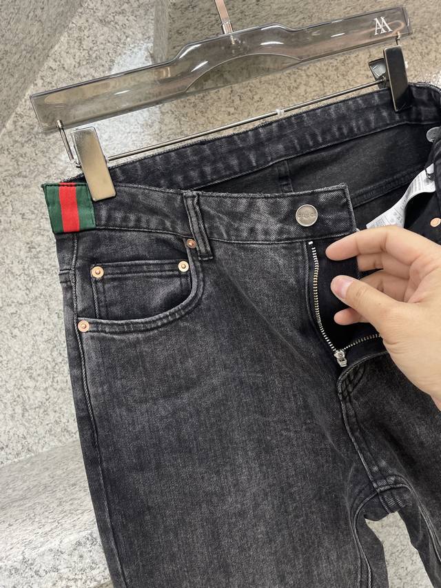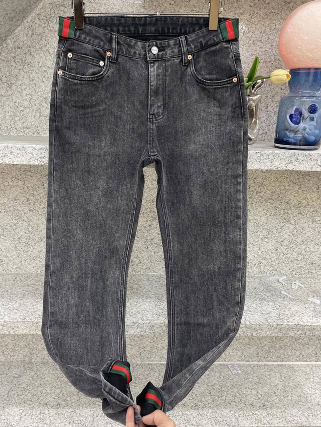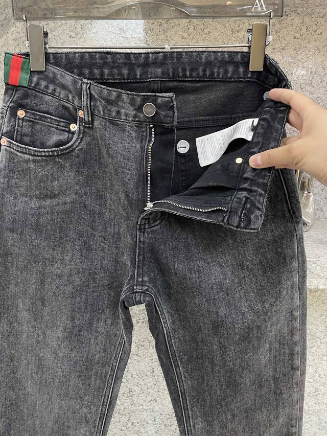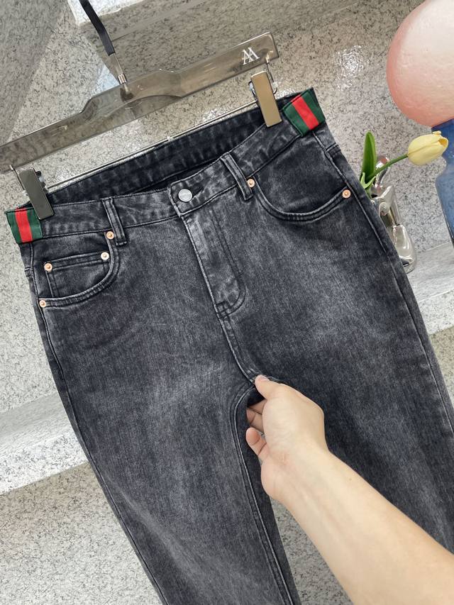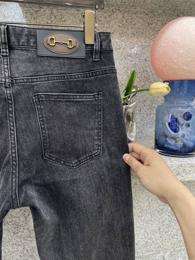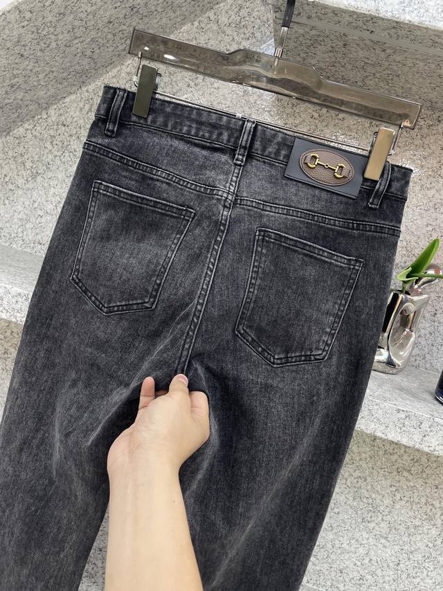 Gugci SS25 hot-selling new product, fully sand-washed and hand-washed autumn and winter jeans, soft and skin-friendly fabric, luxurious first-layer cowhide waistband, classic blue washed counter limited edition, luxurious custom fabric craftsmanship + washing, foreign trade quality, full of details, this color is absolutely in love, hot sale in the counter in autumn and winter, pre-sale sold out, hot-selling style, versatile color, strong cow flavor, stretchy slim fit, small straight pants, size 29-38, 35 available, no 37, size