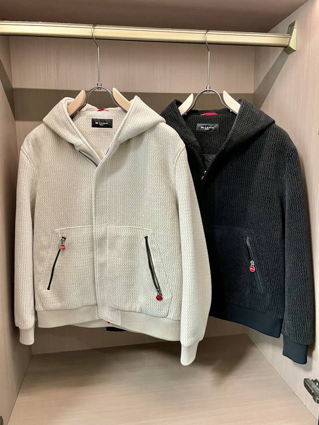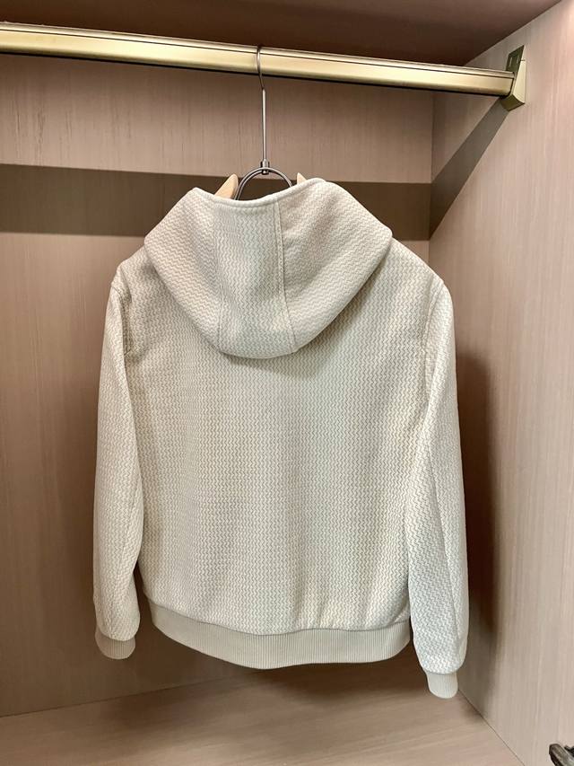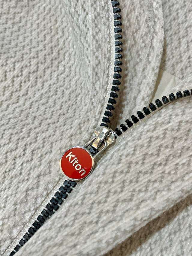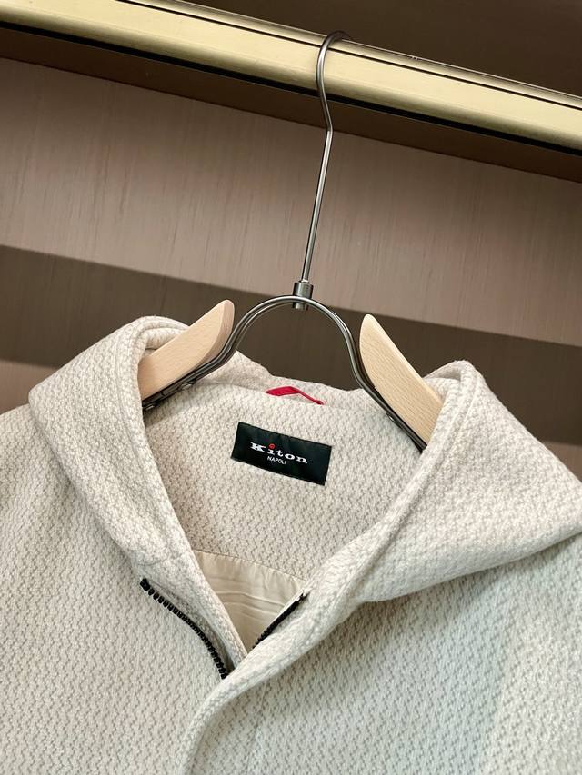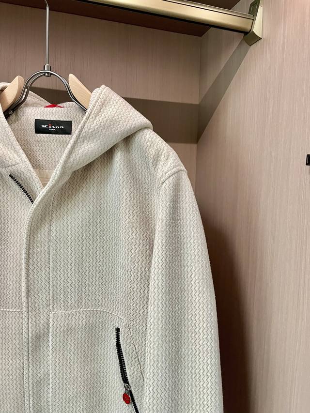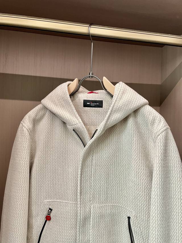 Kiton's new Autumn/Winter 2025 jacket features a unique textured fabric with a delicate texture. The soft, clean off-white hue exudes a sense of luxury. The hooded design is casual and the chest zipper pocket with a red buckle adds a touch of detail to the simplicity, making the overall style both exciting and ingenious. A versatile piece. Available in sizes 48-56