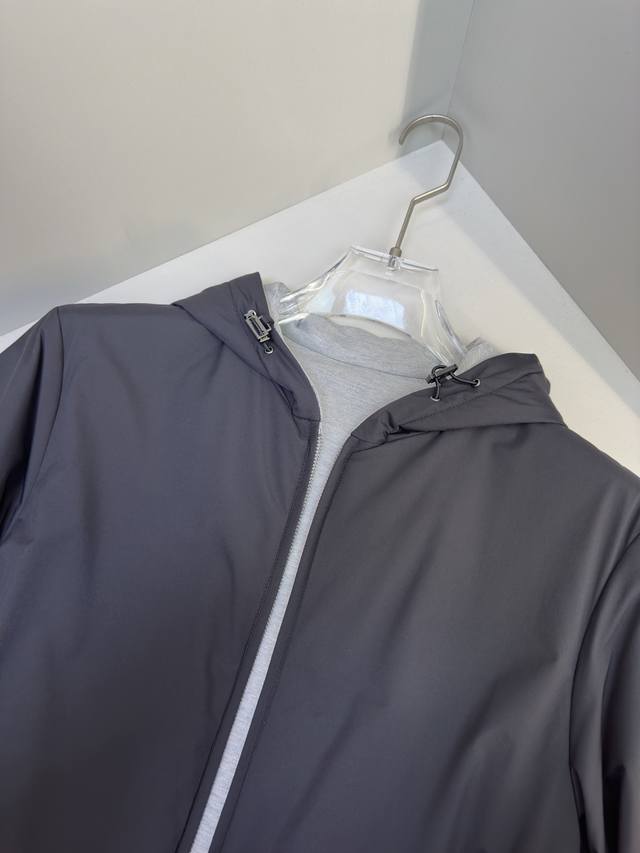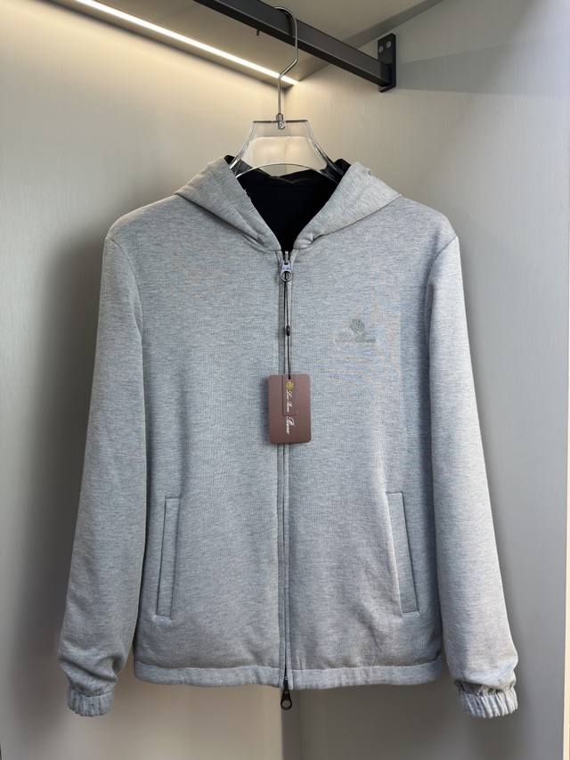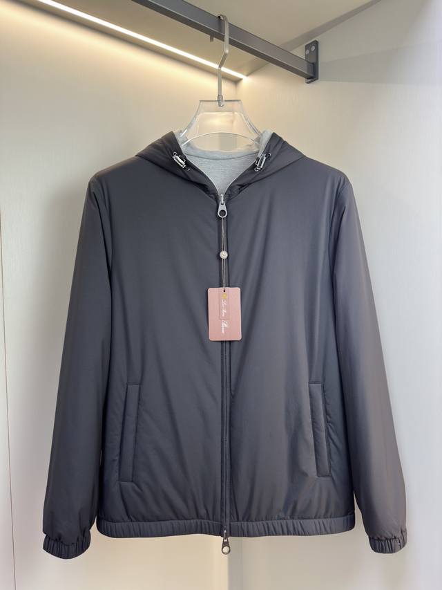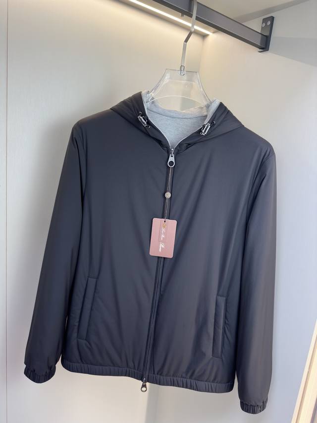 Loro Piana 2025 New Hooded Reversible Jacket DDD This Loro Piana stand-collar jacket features no ostentatious embellishments, only the tailoring refined by centuries of craftsmanship. It fits the body comfortably, offering a polished look for business occasions and a relaxed, effortless style for casual wear. The stand-collar design flatters the neckline, adding a touch of sophistication; the cropped length optimizes body proportions. DDD One side of the jacket is suitable for outdoor activities; the other side is simple and casual, making it a versatile addition to any wardrobe. The brand's classic embroidered logo is presented in a delicate and subtle way, maintaining the minimalist reversible design while highlighting the brand identity and enhancing brand recognition and sophistication. The slightly gathered hem and cuffs add a touch of refinement to the simple silhouette, making it suitable for business occasions and echoing Loro Piana's "understated yet detail-oriented" vintage style. This creates a balance between "relaxation" and "refinement," exuding elegance with every gesture. Sizes: 48, 50, 52, 54, 56 Colors: Black, Navy Blue, Jb16