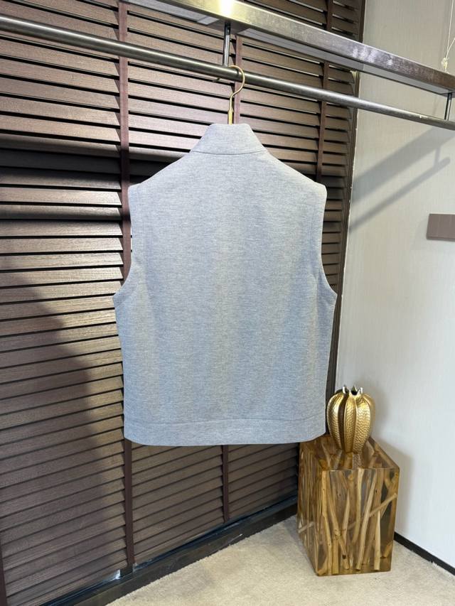 Loro pian&Lp& Loro Pianya Fw2025 new stand-up collar vest jacket. The latest wardrobe addition. Made of a wool, acetate, and eco-friendly polyester blend, it's comfortable, wrinkle-resistant, and stylish. The stand-up collar and symmetrical pockets create a refined and stylish look. The three-dimensional cutting and stitching create a sophisticated feel. The zipper head features the brand's hardware logo for high recognition. The high-thread count lining adds a luxurious feel. This vest is suitable for a variety of occasions and ages.