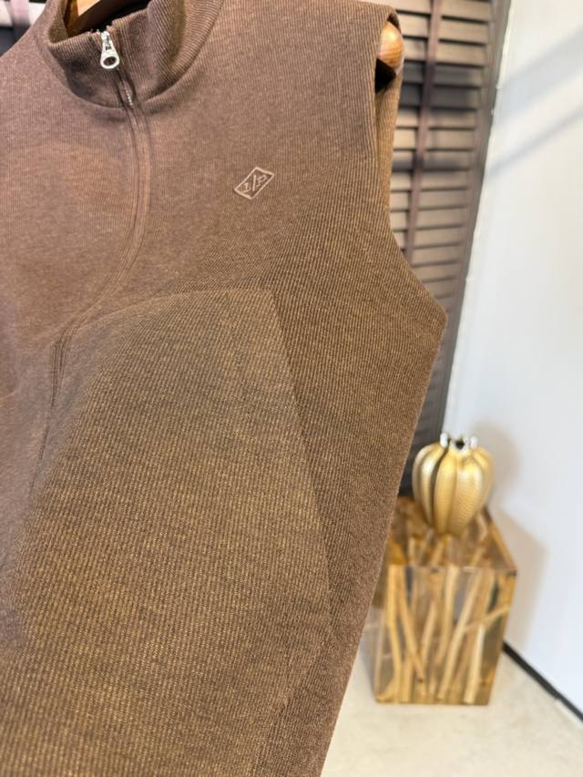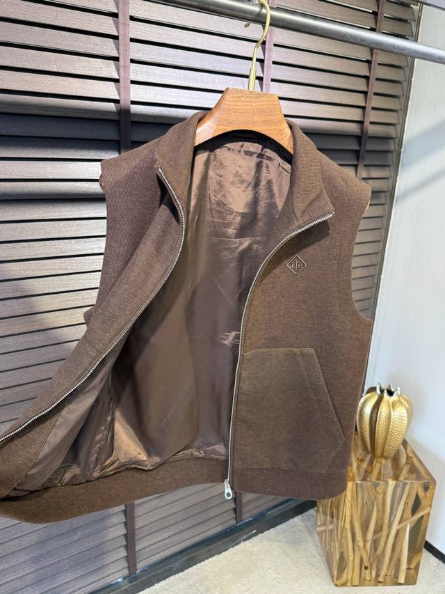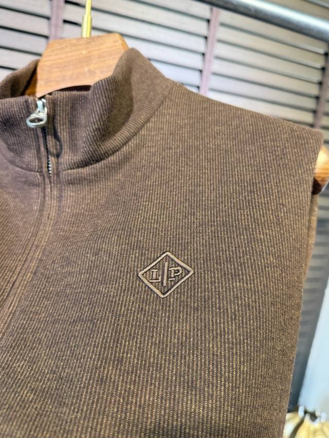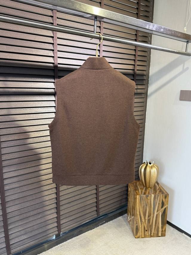 Loro pian&Lp& Loro Pianya Fw2025 new stand-up collar vest jacket. The latest wardrobe addition. Made of a wool, acetate, and eco-friendly polyester blend, it's comfortable, wrinkle-resistant, and stylish. The stand-up collar and symmetrical pockets create a refined and stylish look. The three-dimensional cutting and stitching create a sophisticated feel. The zipper head features the brand's metal logo for high recognition. The high-thread count lining adds a luxurious feel. This vest is suitable for a variety of occasions and ages.