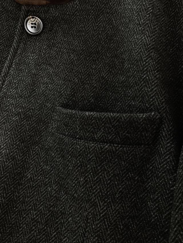 Wool Trench Coat | A Gentle Resonance of Italian Luxury and Ingenious Fabrics. Crafted from a cotton and Tencel blend, the herringbone pattern blends light beige and dark gray for a subtle, luxurious feel. Every inch of the fabric imbues the precision of Italian craftsmanship. The patchwork of brown suede at the collar creates a dialogue between retro and modern styles, while the crisp silhouette effortlessly adapts to both urban commuting and outdoor leisure. Exclusive