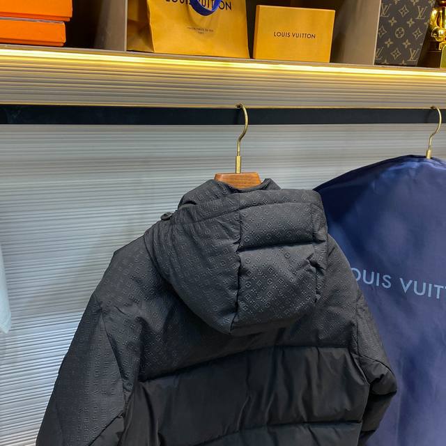 LV25Fw New Autumn/Winter Down Jacket with Monochrome Pattern and Zipper. Unisex style, hooded, stand-up collar, removable rubber nameplates on the sleeves! Available now through trading channels and on the official website! V's new down jacket is a hot winter fashion item. Not only does it offer excellent warmth, it also incorporates classic brand elements for a uniquely stylish and sophisticated look. The