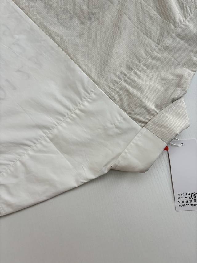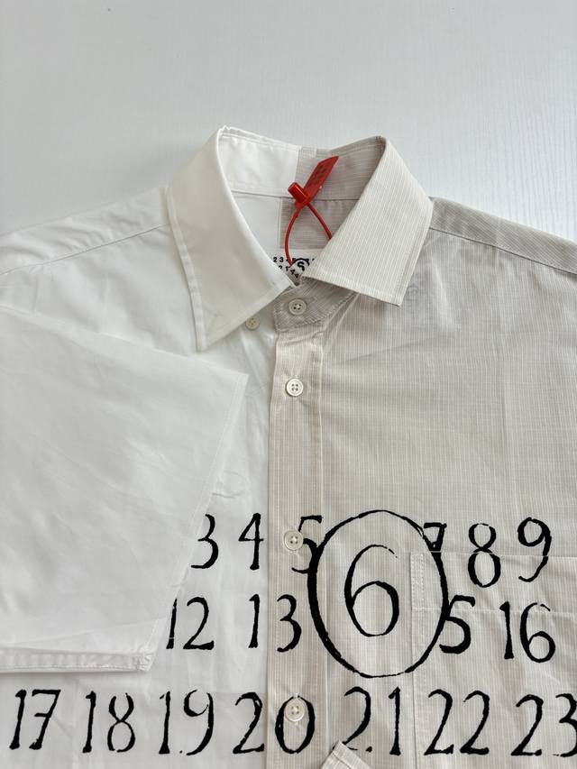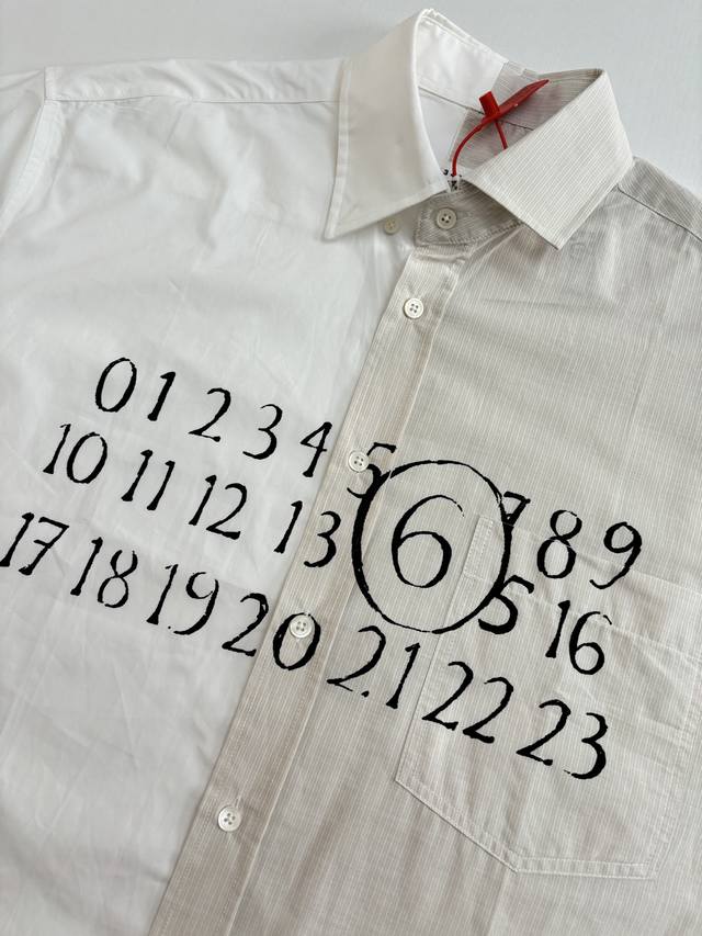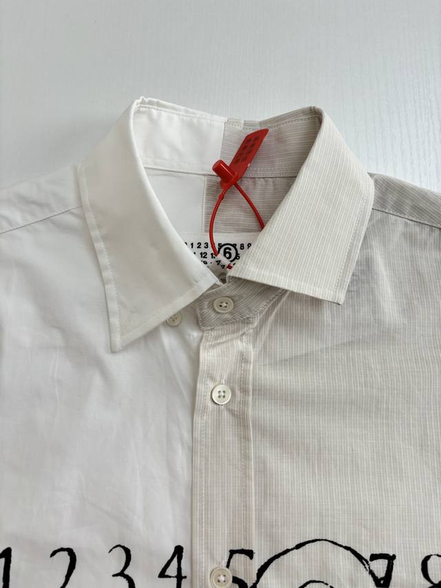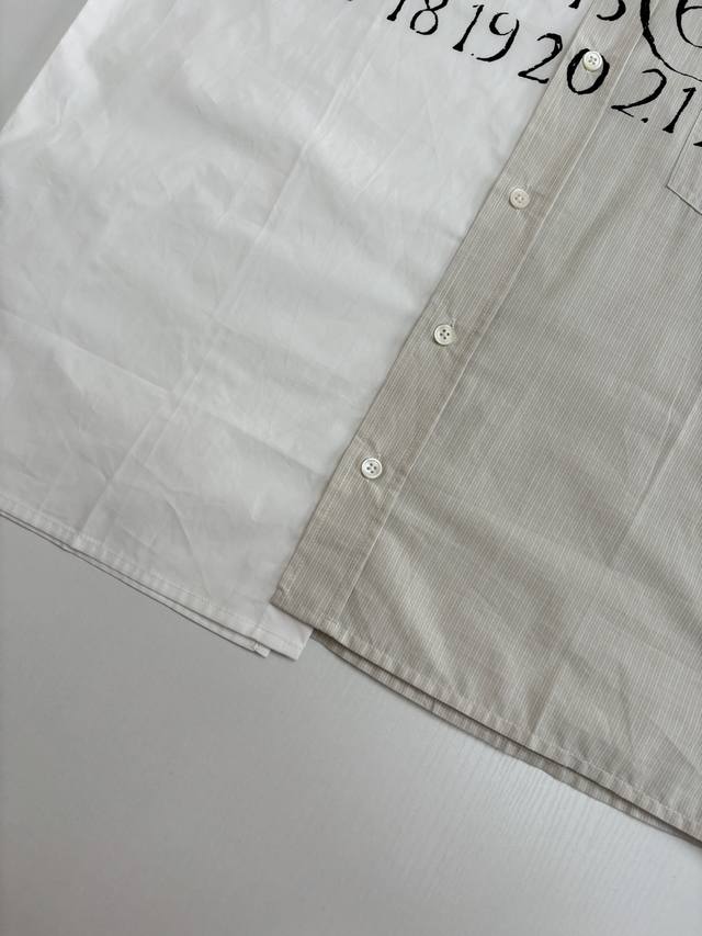 Maison Margiela* Mm6 Margiela 25Ss New Digital Print Color Block Shirt DDD Custom-made all-cotton fine-pleated striped satin shirt fabric and thin plain weave elegant wrinkle-resistant fabric, exquisite, delicate, comfortable and skin-friendly. The pure white and soft beige are cleverly spliced together, just like a subtle balance of rationality and sensibility, exuding comfort and laziness. The numbers and symbols on the shirt are arranged in an artistic manner, adding a touch of mystery and modernity to the overall look, walking in the fashion map of the city with a unique attitude. DDD Artificial distressed tassels, through fine tailoring and clever sewing techniques, make the edges of the fabric present a natural distressed and tassel effect, which not only adds a sense of layering, but also gives it a unique dynamic beauty. DDD Size: SML XL DDD