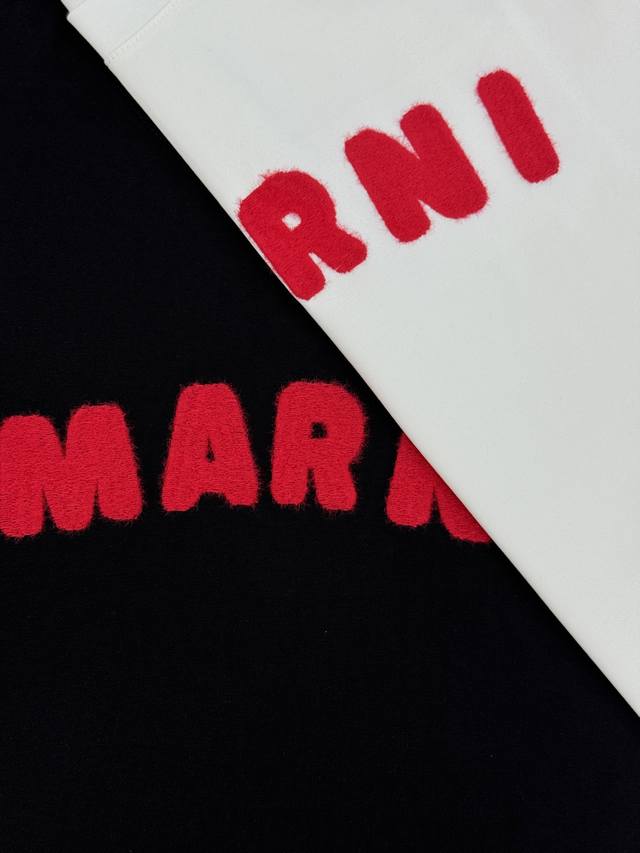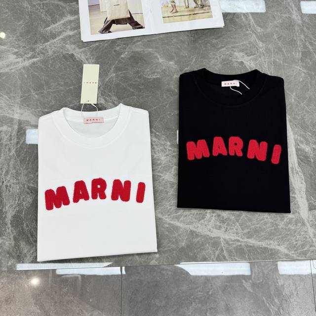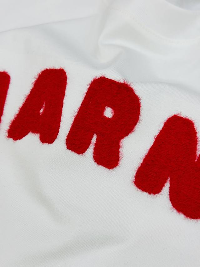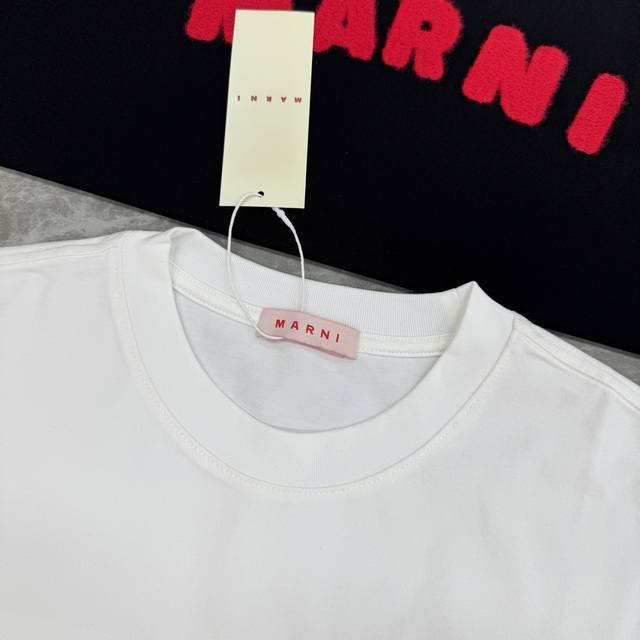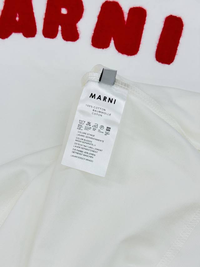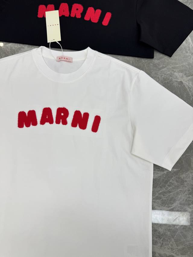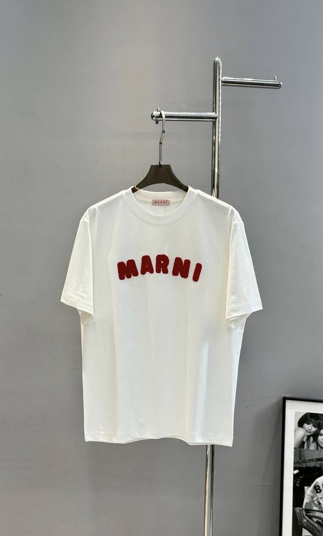 Marni 26S Original Short-Sleeve T-Shirt. Unisex classic Marni logo. Highly recognizable red flocked logo on the chest, with a three-dimensional feel and soft touch. Made of pure cotton, comfortable and breathable. A summer essential. The loose fit is flattering for various body types. Pairs easily with jeans or cargo pants for a simple yet stylish look. Colors: White, Black. European Sizes: S-XL. Recommended size: M (175cm, 145kg).