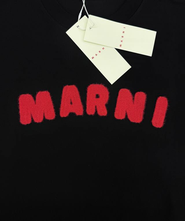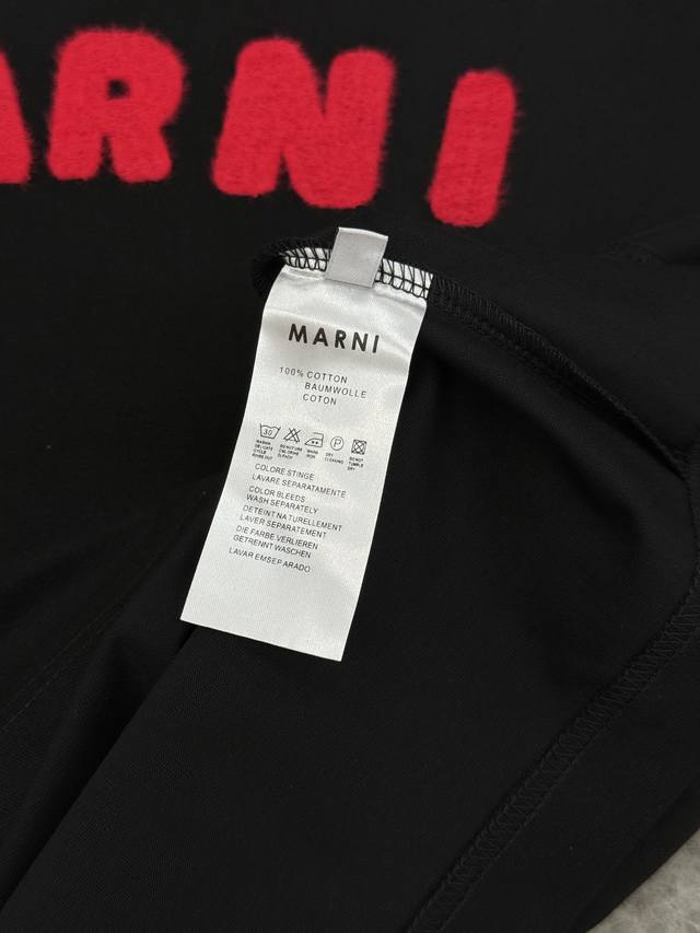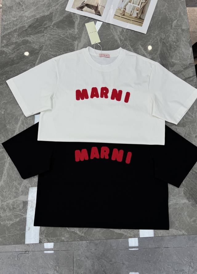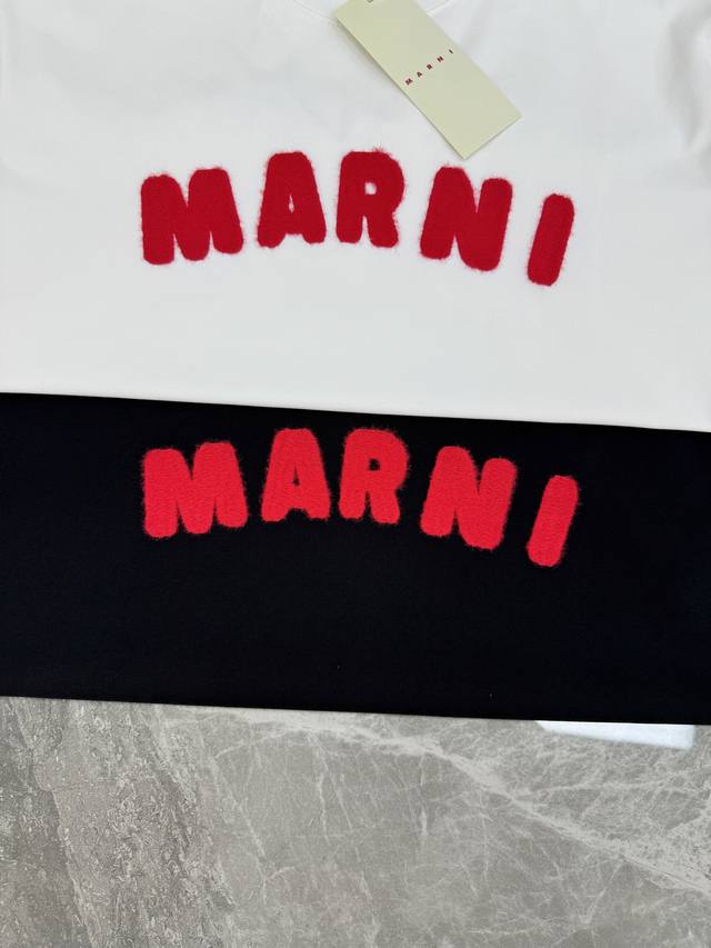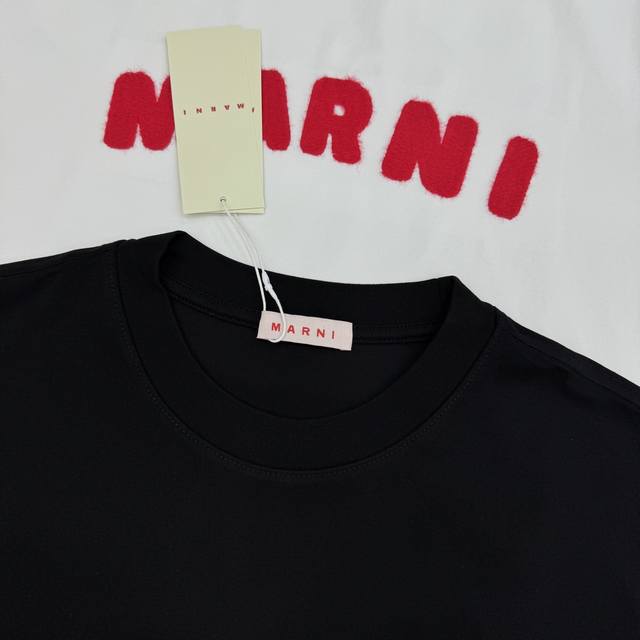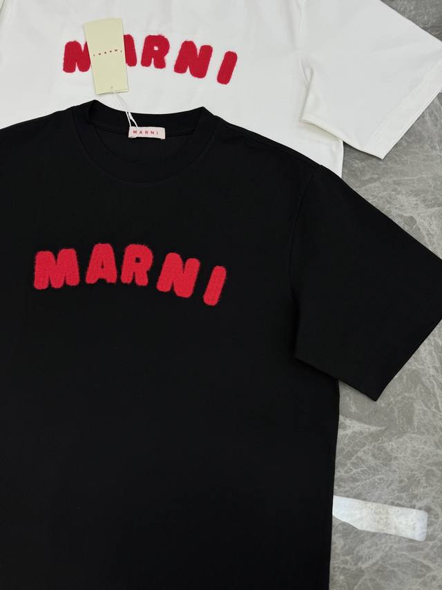 Marni 26S Original Short-Sleeve T-Shirt. Unisex classic Marni logo. Highly recognizable red flocked logo on the chest, with a three-dimensional feel and soft touch. Made of pure cotton, comfortable and breathable. A summer essential. The loose fit is flattering for various body types. Pairs easily with jeans or cargo pants for a simple yet stylish look. Colors: White, Black. European Sizes: S-XL. Recommended size: M (175cm, 145kg).