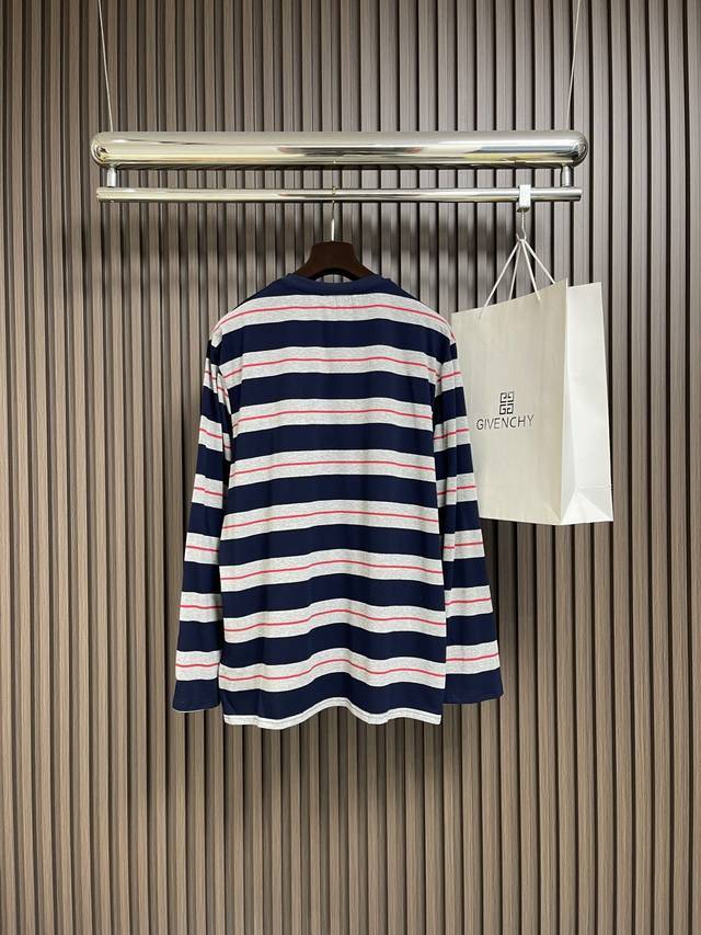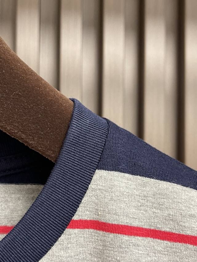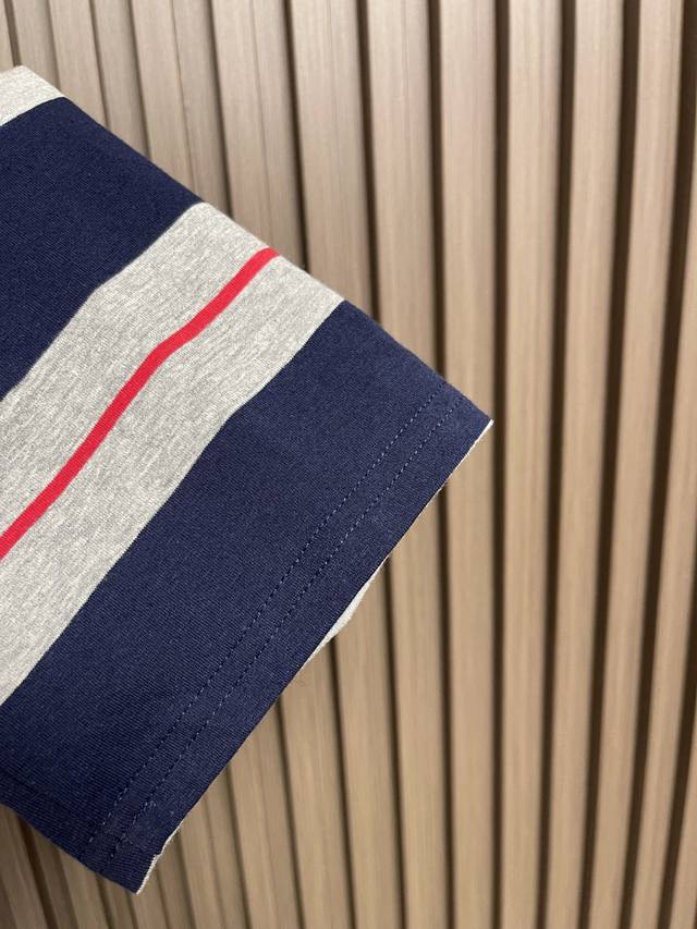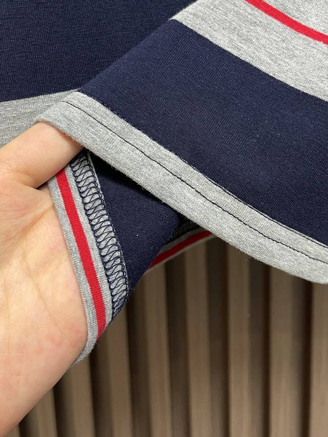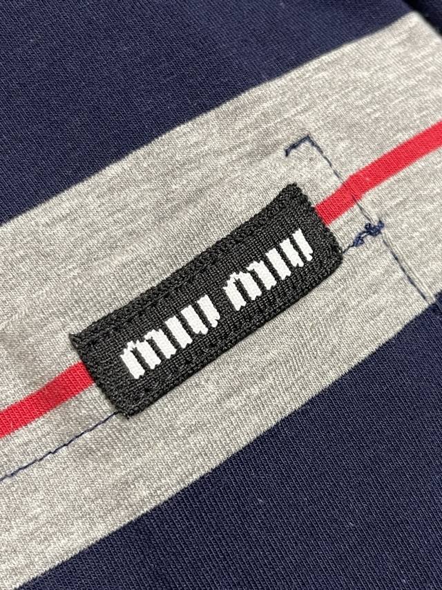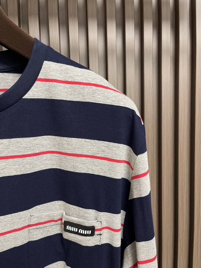 Miumiu 2025Ss poster-style long-sleeved T-shirt with wide gray-blue logo stripes. Woven from 60s double-ply yarn: Made from 60S 200g high-count combed cotton, the double-twisting process enhances yarn strength, making the fabric finer, crisper, and wrinkle-resistant while maintaining a soft, next-to-skin feel. Plain knit construction: The classic jersey knit offers excellent stretch and drape, perfect for a slim fit, and features consistent texture on both sides, ensuring precise stripe registration. From yarn ratio and density to weight, everything is custom-made to the original design to ensure color saturation and stripe clarity. Piece registration: During cutting, the stripes on the front and back panels, armholes, and side seams are strictly aligned. The shoulder and armholes are cut on the bias to reduce distortion. Due to the extremely high alignment requirements, fabric utilization can be as low as 60%, compared to 85% for standard garments, significantly increasing costs. Sizes: S-Xl