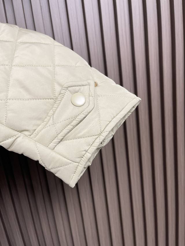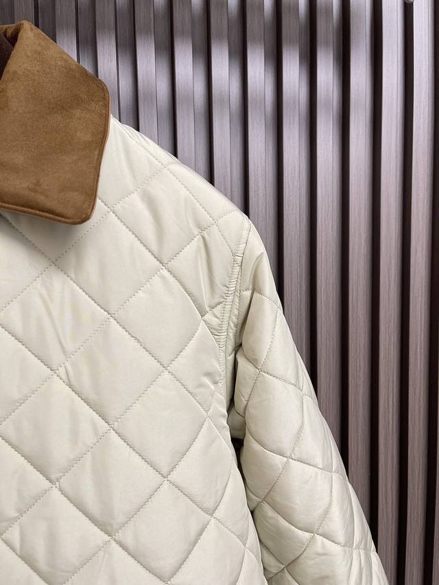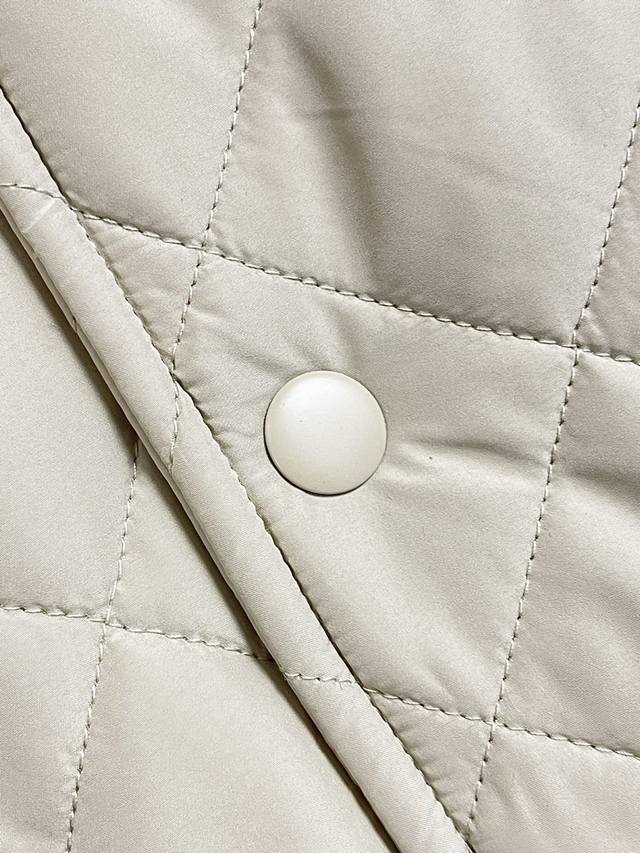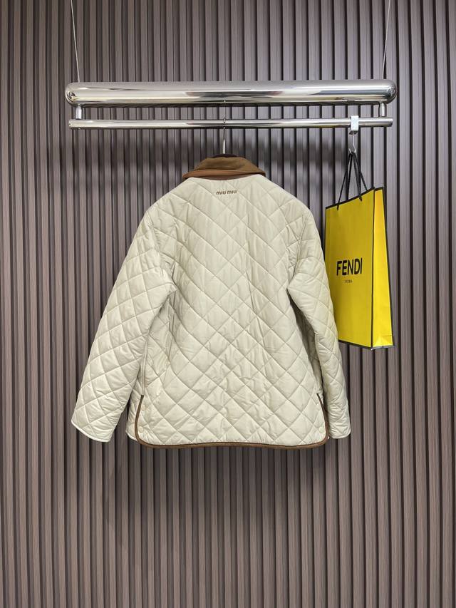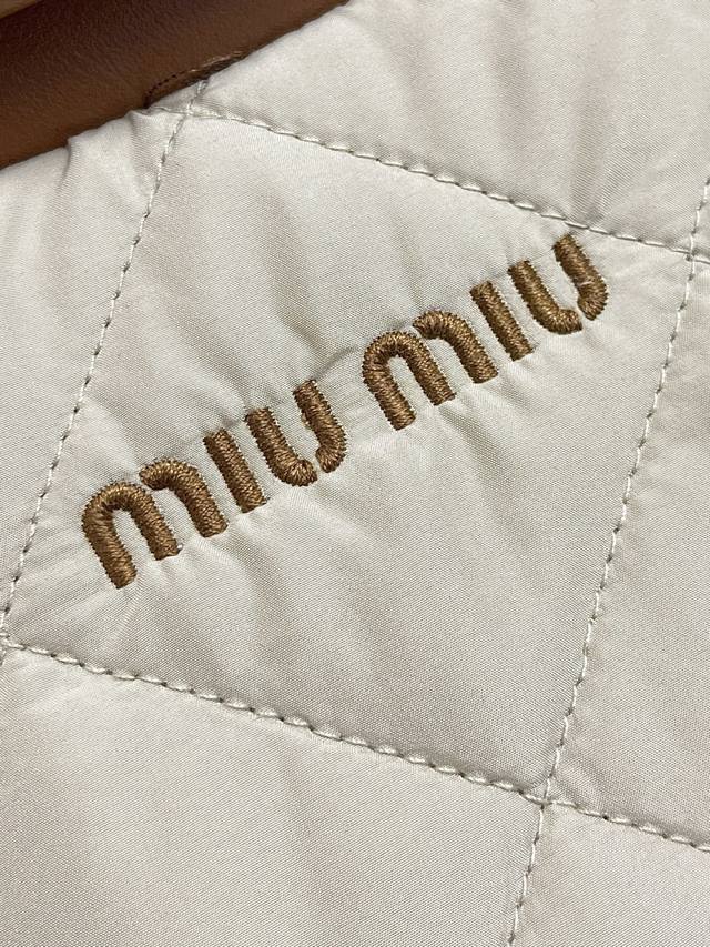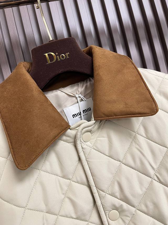 Miumiu's new 2025Ss diamond-patterned lapel padded jacket is custom-made from imported YB windproof and waterproof nylon. Its craftsmanship is refined and upgraded, enhancing its fall and winter warmth. Down-filled lining provides lightweight warmth, contrasting lambskin trims, and contoured pockets. Diamond-embossed flap pockets provide hand warmth and increased storage. The versatile design features snap-button slits at the hem for a more comfortable fit and a wealth of accommodating details. This jacket showcases a low-key, sophisticated aesthetic, transcending the dull and unassuming. It combines warmth and style with custom-made fabrics and accessories. Sizes: S-Xl