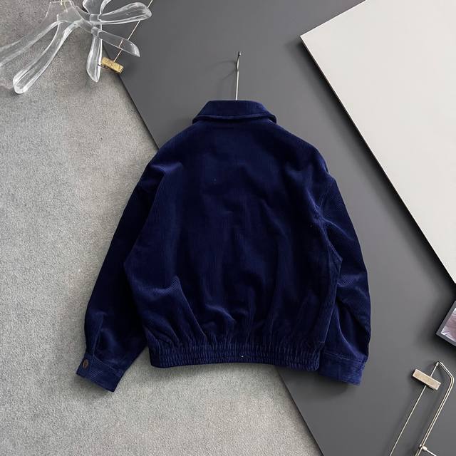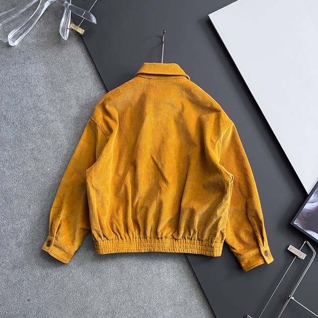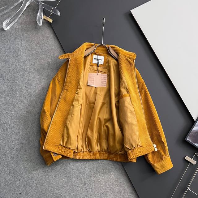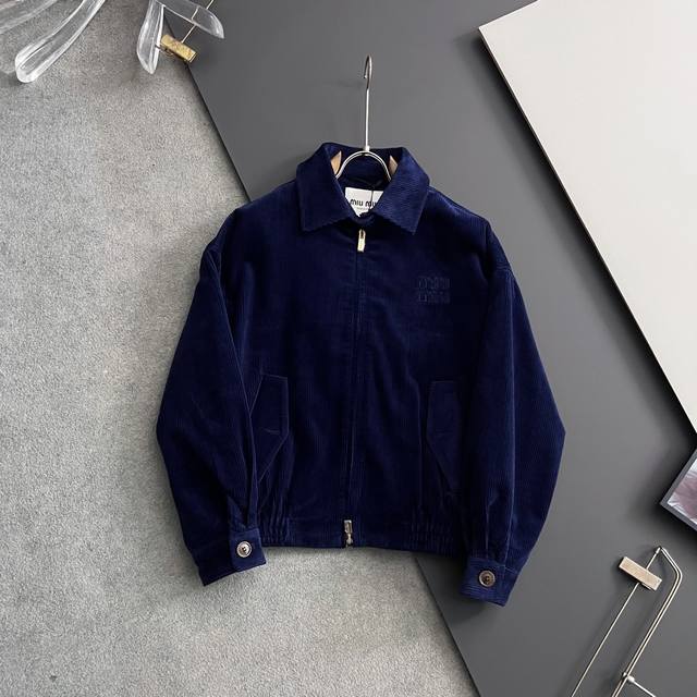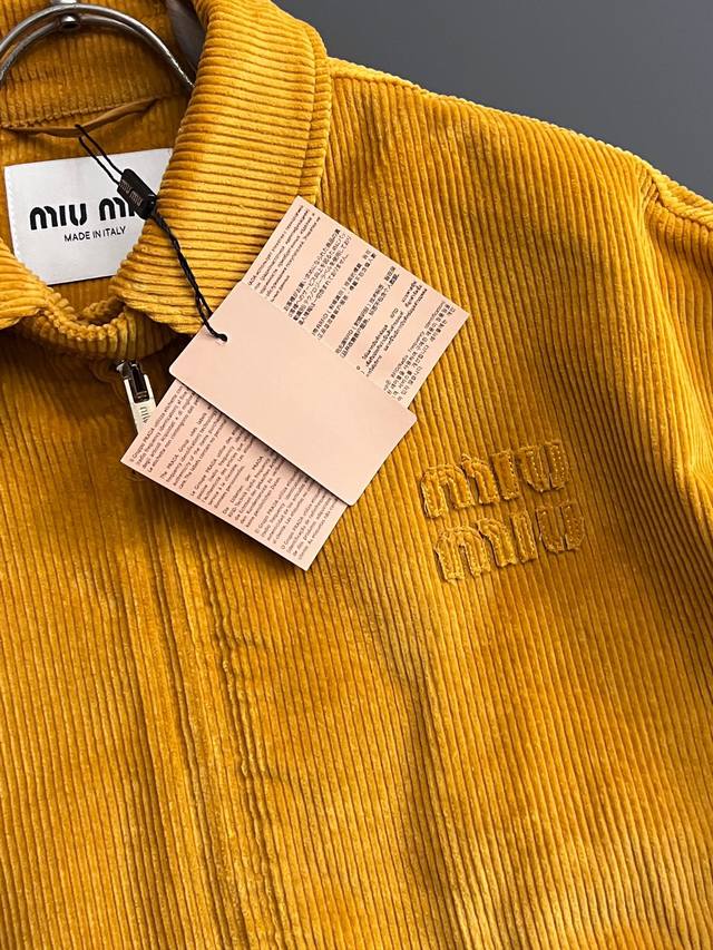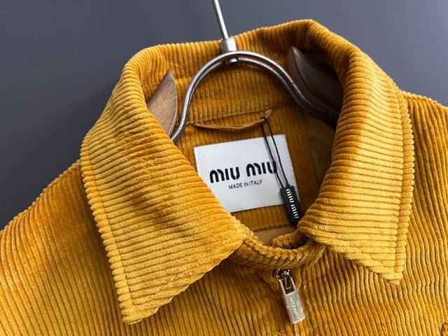 Miu's matching couple's style corduroy jacket with vertical stripes and lapels for Early Fall 2025 is one of this season's most anticipated pieces, with its unique details and refined texture. Crafted from high-quality corduroy fabric, the jacket features delicate vertical stripes that create a subtle, luxurious sheen in the interplay of light and shadow. The classic lapel design boasts clean, flowing lines that perfectly flatter the neckline. Custom ribbing at the neckline, cuffs, and hem enhances durability while highlighting the exquisite craftsmanship. The