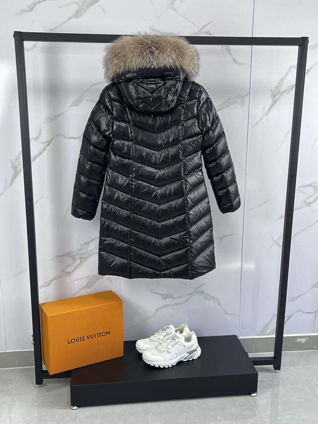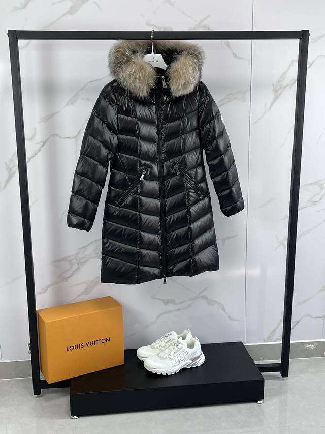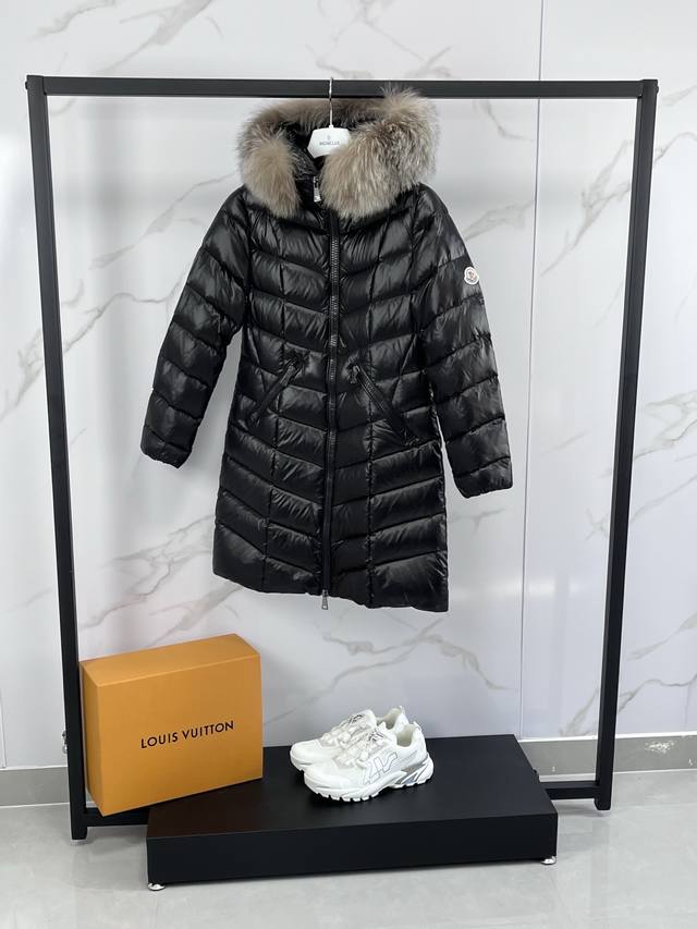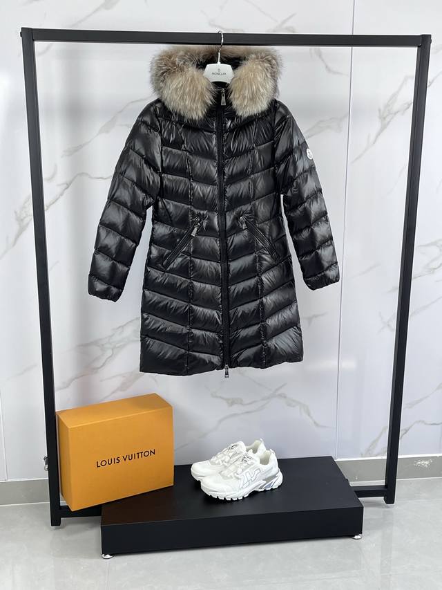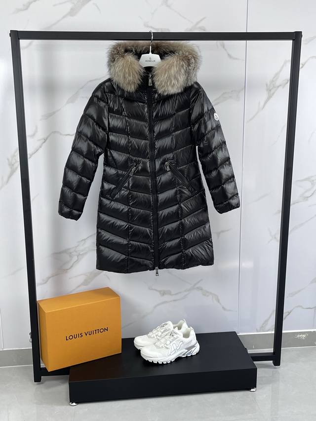 Mon* Fulmarus Women's Long Hooded Down Jacket. When you need extra warmth without sacrificing quality, choose Fulmarus! This long coat, crafted from patent nylon and featuring a unique herringbone pattern quilting, provides warmth and style. The hood, featuring a frosted fox fur lining, is a striking addition to the winter's warmth. Sizes: 1-4