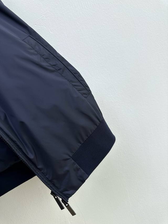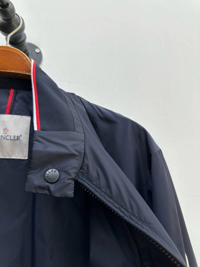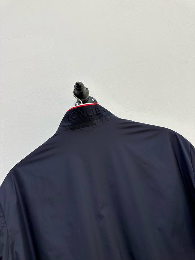 Made of compact nylon fabric with excellent functionality, the jacket features a classic silhouette with a snap collar and a knitted tricolor ribbon with embossed logo. It also features a two-way zipper closure,