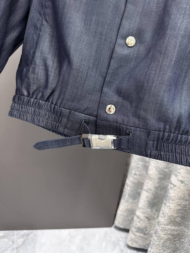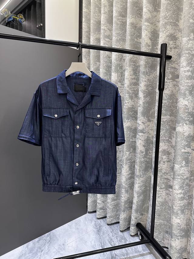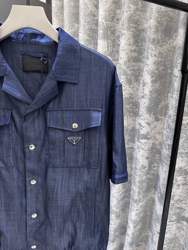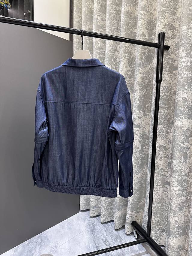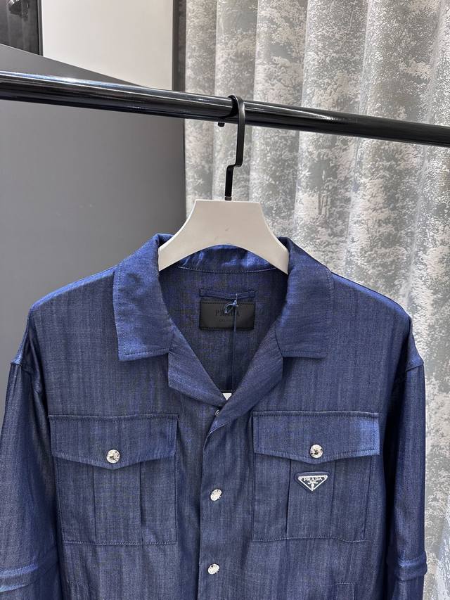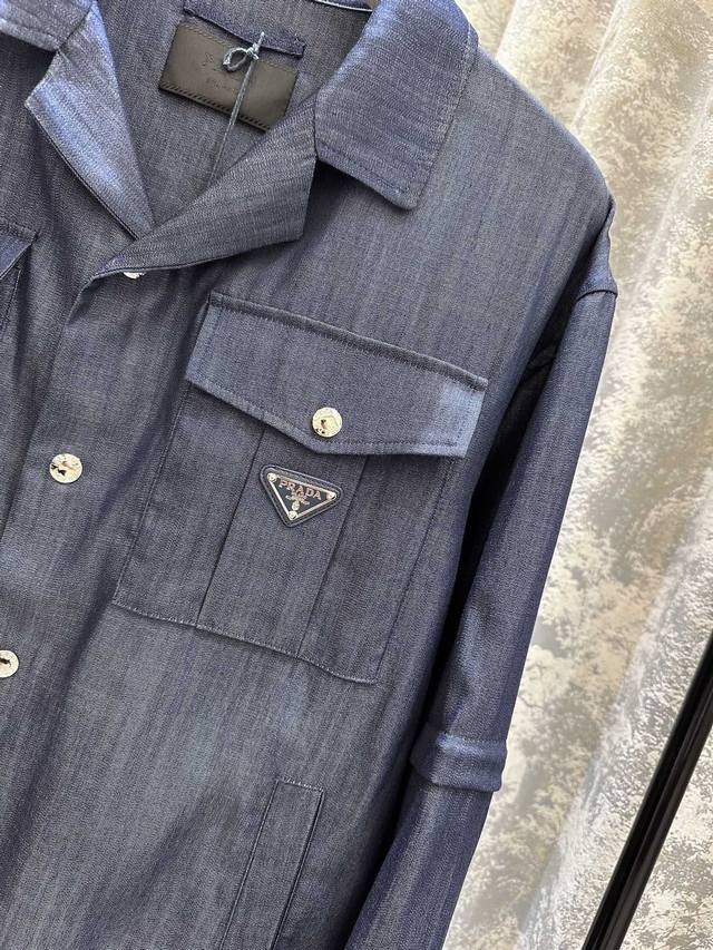 New Arrival 25Ss Early Fall pr*Da Milano Classic Denim Shirt Jacket with Detachable Sleeves. This ultra-fresh denim blue shirt jacket showcases both a savory and sweet vibe. Made from Okayama-woven, Japanese denim cotton, this fabric is a true authentic denim. The washed finish creates a unique, vintage-inspired softness, with an exceptionally soft and refined texture. The 3D button closure adds a touch of class. The chest pockets and classic triangular iron badge create a trendy and fashionable design. The detachable sleeves highlight the jacket's uniqueness and practicality. The professional overlock stitching creates a seamless, seamless fit. Sizes: M-Xxxl. M: Shoulders 47, Bust 112, Length 65, Sleeves 63. L: Shoulders 48, Bust 116, Length 66.5, Sleeves 64. Xl: Shoulders 49, Bust 120, Length 68, Sleeves 65. Xxl shoulder width 50 chest 124 length 69.5 sleeves 66