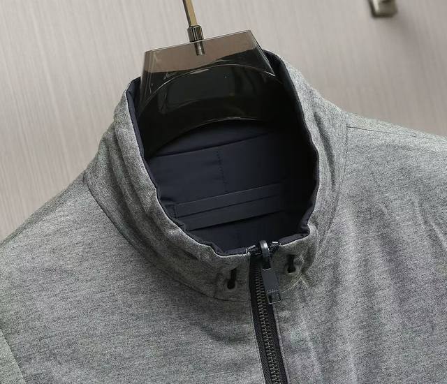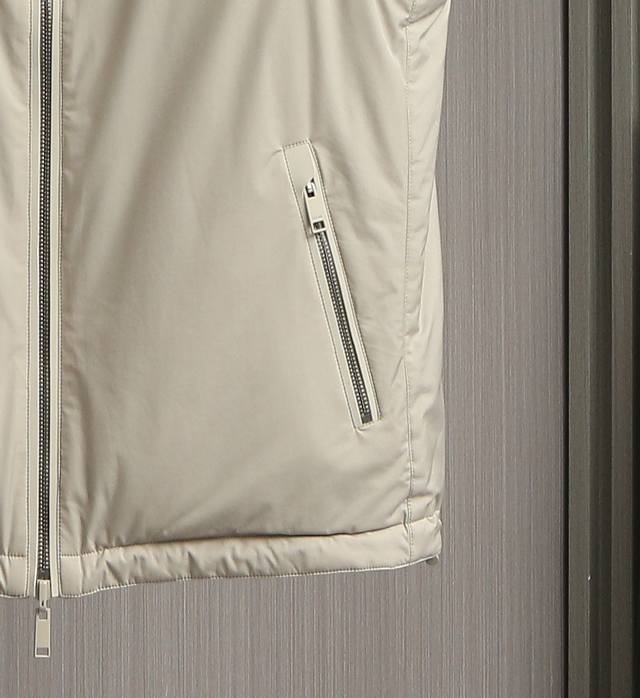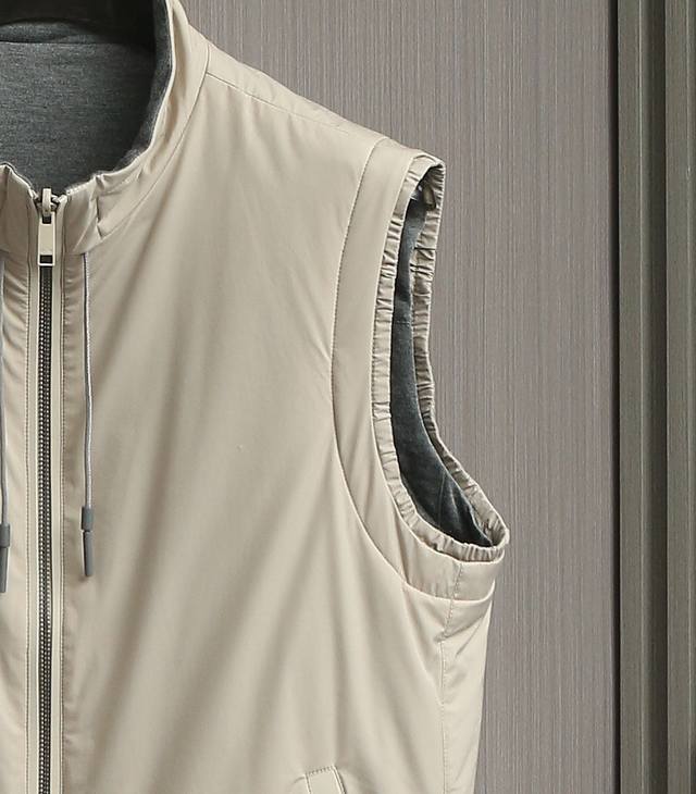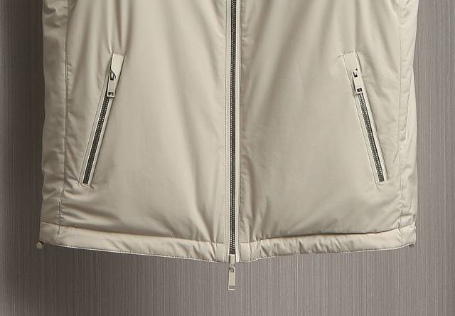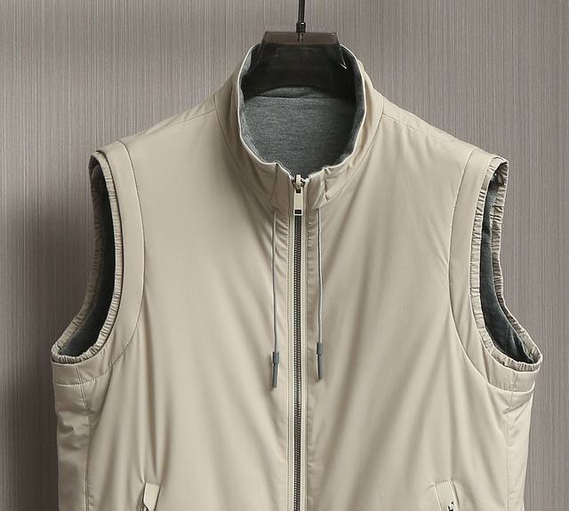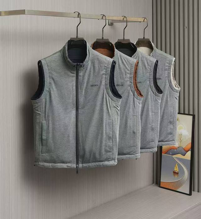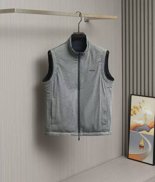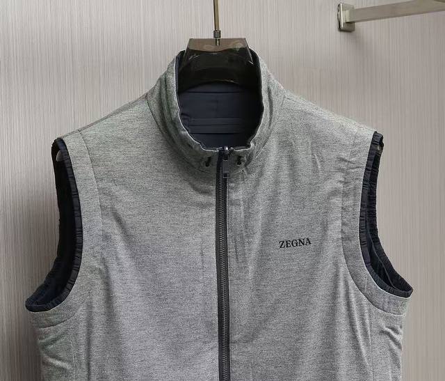 New arrivals! Zegna's new 2025 double-sided stand-up collar vest. This Zegna jacket features a casual silhouette and sleeveless design, adding versatility to any outfit. Its streamlined silhouette allows for ample room for movement, making it suitable for a variety of everyday situations. Its simple, clean design makes it easy to layer and style, perfect for a variety of outfits, from casual daytime to light outdoor activities, creating a relaxed and effortless look. One side features a simple, casual design perfect for everyday wardrobe versatility. The other side incorporates Zegna's signature hot-stamped lettering, presented in a compact, refined form. This design maintains the reversible design's simplicity while highlighting the brand's identity, enhancing its recognizability and sophistication. A unique leather strap at the back complements the reversible design, allowing each side to display different colors and textures, perfect for every mood and occasion. Create a personalized look, enrich your wearing experience, and achieve the ultimate "one piece, two pieces" look. Sizes: 48, 50, 52, 54, 56. Colors: Black, Navy, Gray, Yellow.