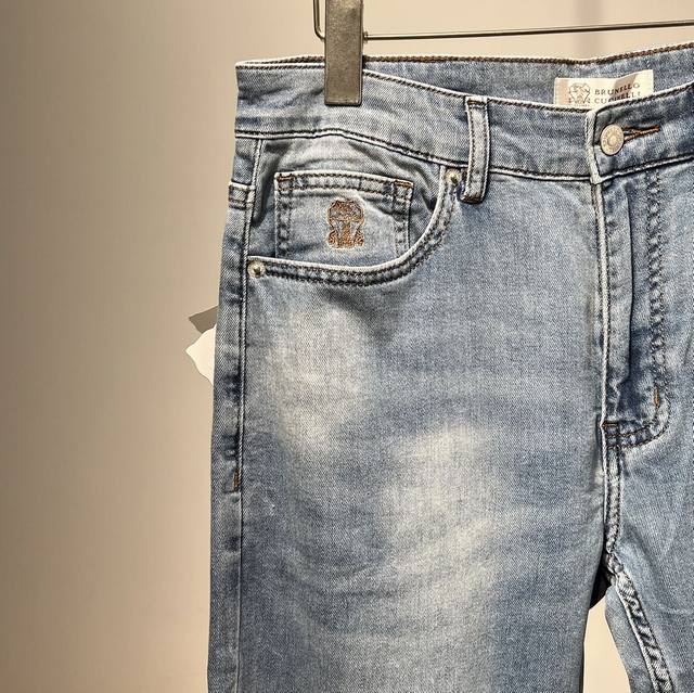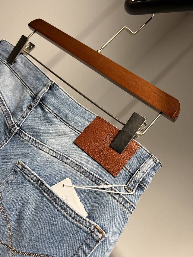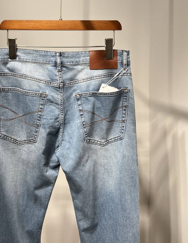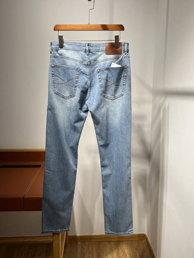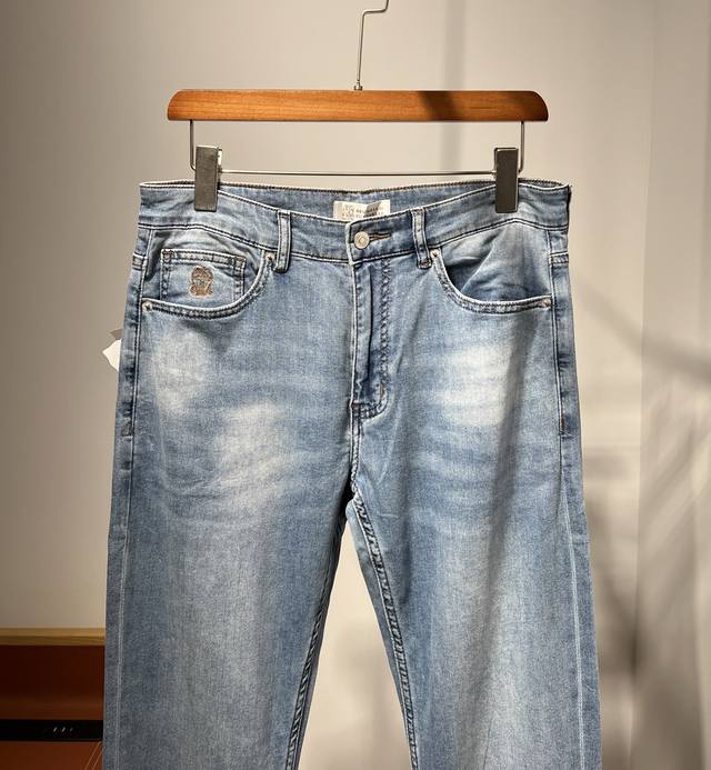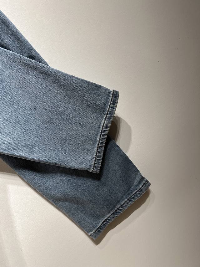 New Bc~2025 Spring/Summer Men's Business Casual Blue Denim Slim Jeans. Sourced from a trading company, these jeans are manufactured by a high-end, OEM manufacturer. 100% authentic quality. With 25 years of experience, these jeans have been a season-defining hit, a true textbook example! These aesthetically pleasing pants, focused on fabric and quality, maintain the essence of traditional design. Label elements are perfectly integrated, with a new leather patch on the back pocket and the classic metal triangle logo, creating a unique and distinctive look.