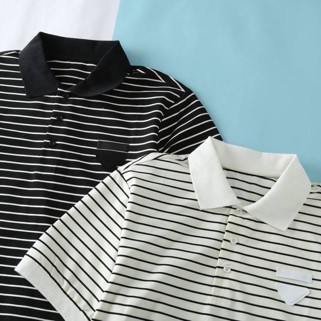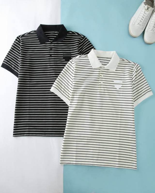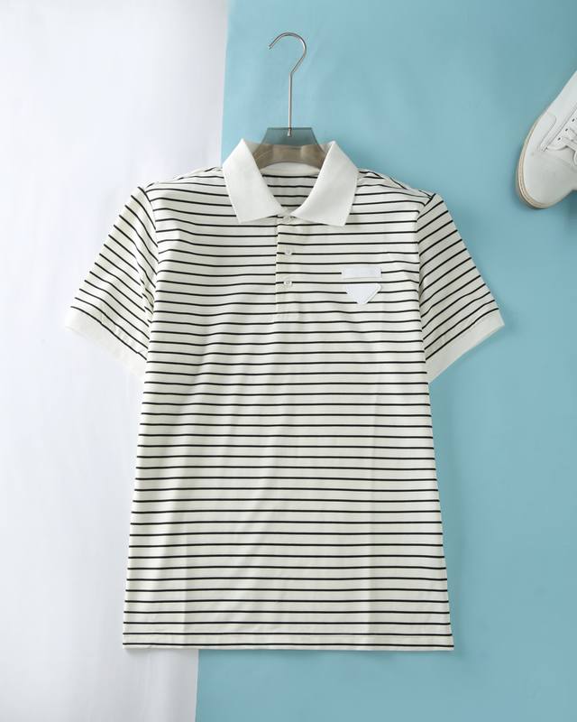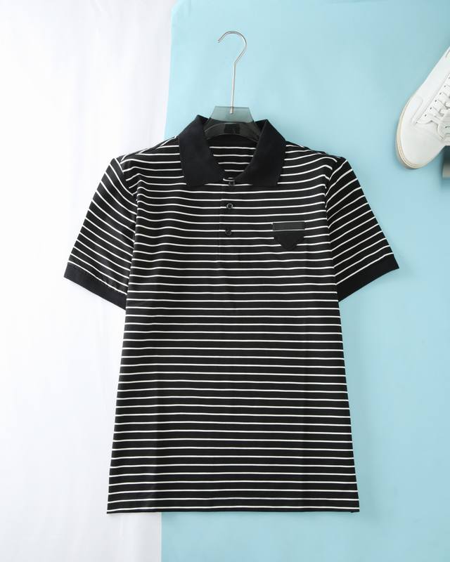 New Pa*La 2025Ss Summer New Style, Men's Business Casual Short-sleeved Polo Shirt with Triangle Label Fabric Decoration on the Chest! The trading company channel is rare, leading Gw for sale! The pure cotton fabric is selected. This fabric is known as "breathable air cotton". It not only has excellent breathability, allowing the skin to enjoy the lightness and freedom like clouds in the hot summer, but also through the unique weaving process, it gives the clothes a cloud-like cotton feeling. The classic striped contrasting design on the body of the clothes is like the smooth lines of the Italian painter, interweaving a unique charm that is both retro and modern! The simplicity of the stripes contains an extraordinary style, gently outlining the wearer's body contour, showing a low-key and advanced beauty! The exquisite triangle label patch logo on the chest is embellished in a low-key and noble way, as if it is a little ingenuity of the craftsman's heart, showing the brand's ultimate pursuit of details and the brand's profound heritage! No matter you wear formal attire to attend business occasions or wear casual attire to enjoy your leisure time, you can show your unique charm and demeanor! Item No.: D2407 Size: 48 M-56 3Xl