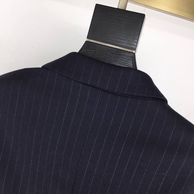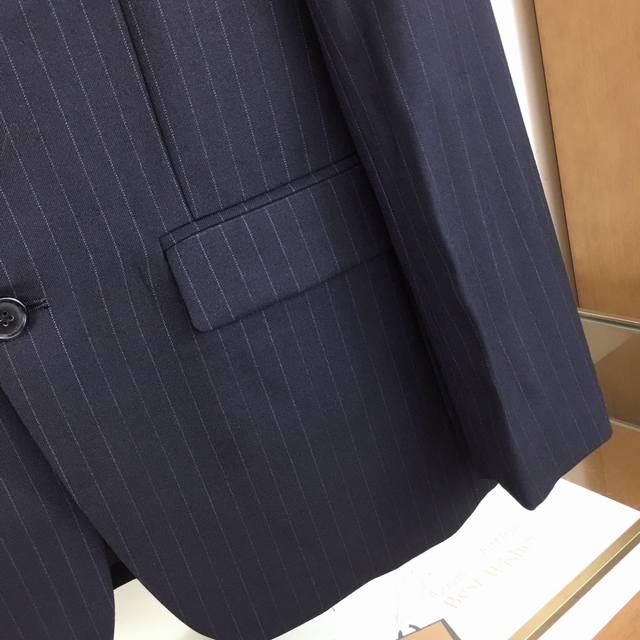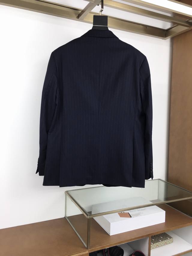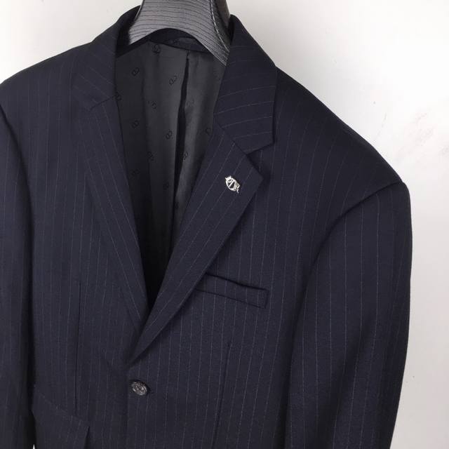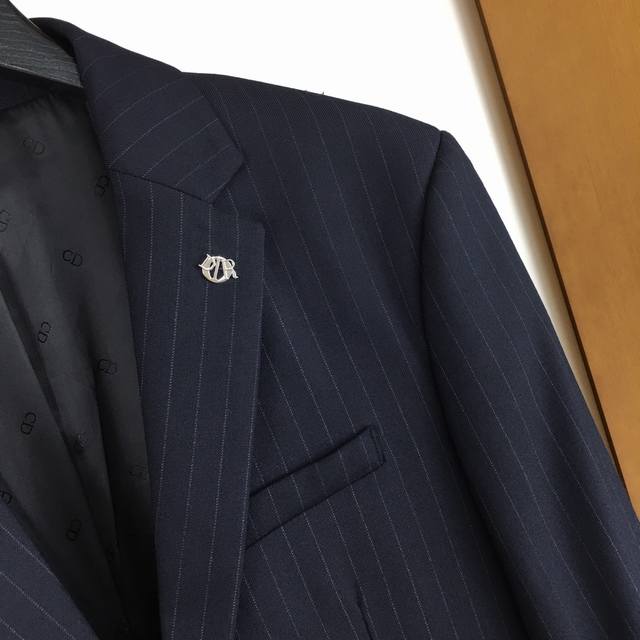 Design Elements: The Dio..R Men artistic director, embracing Dio..R's heritage and paying homage to exquisite tailoring, imbues the aesthetic of the single-breasted jacket with a modern flair. Crafted from a wool and mohair blend, this piece features a navy stripe design and a notched lapel adorned with the iconic Di*R emblem. The interior is lined with oblique yarn-dyed jacquard, creating impeccable detailing and a touch of craftsmanship. Understated yet refined, this elegant piece can be styled with any style.