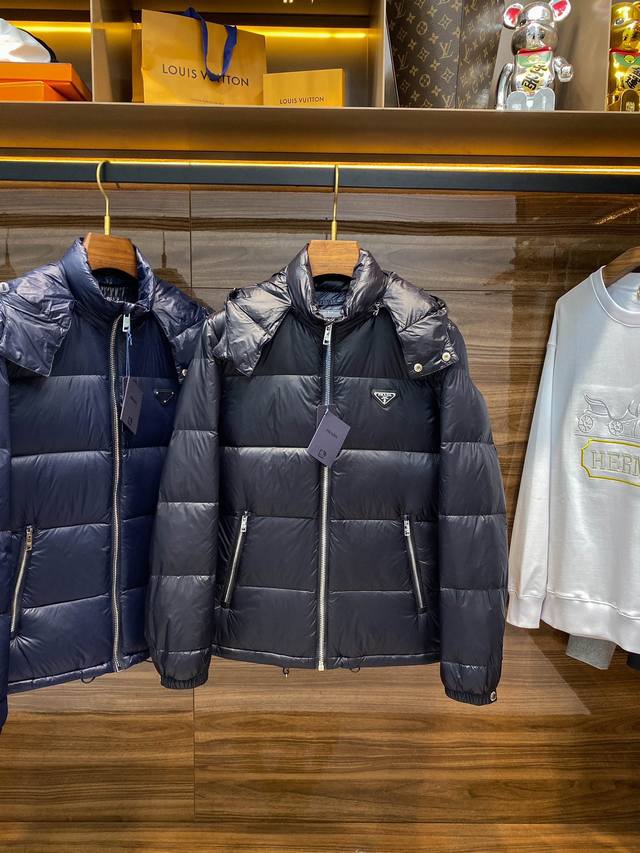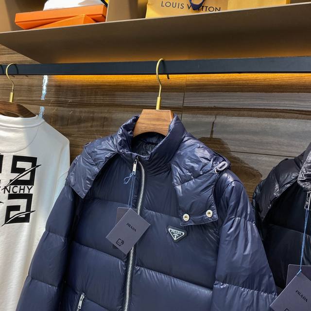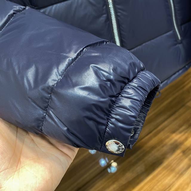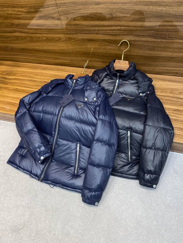 pra25Fw New Fall/Winter High-Density Nylon Zipper Down Jacket. Men's hooded, stand-up collar, classic triangle logo, detachable logo badge! Available now through trading channels and on the official website for 27,070 RMB! This highly sought-after item from the P-brand collection is a stylish and practical piece that you can't go wrong with!