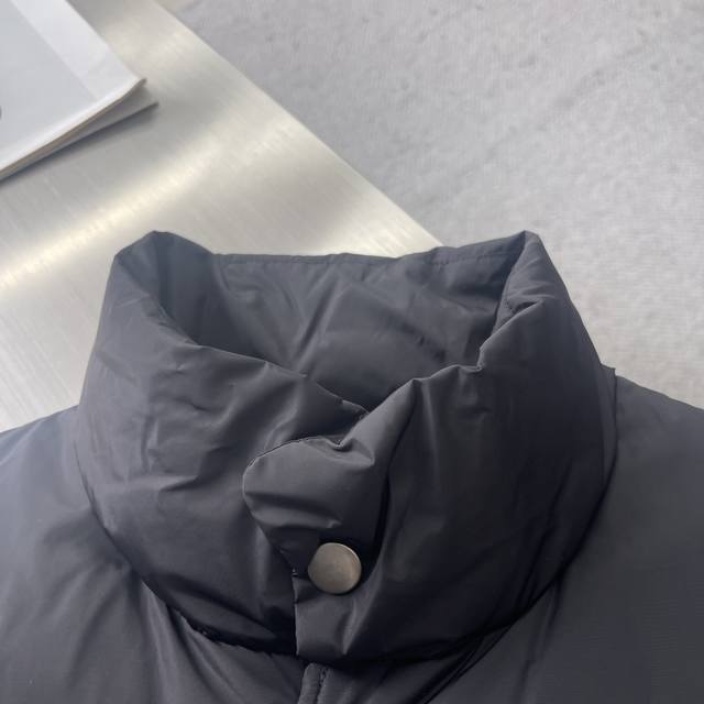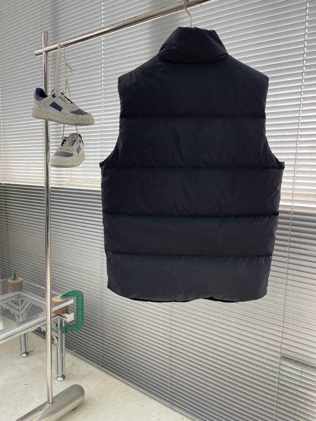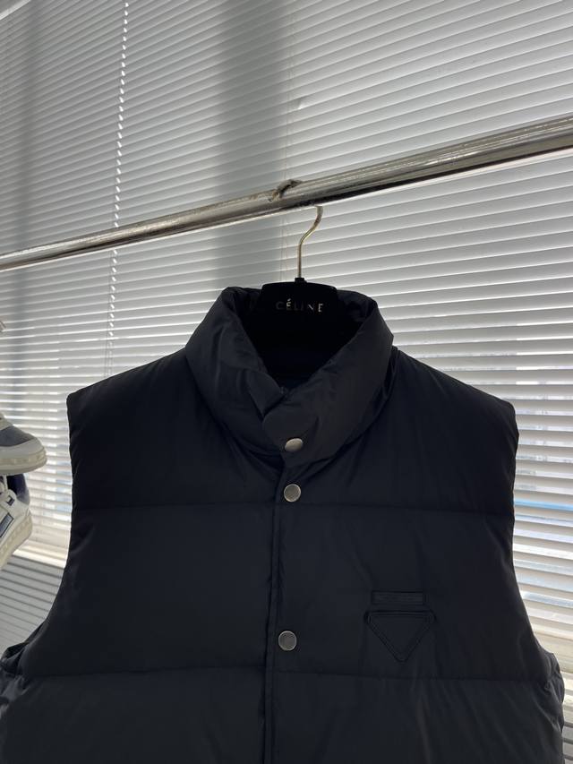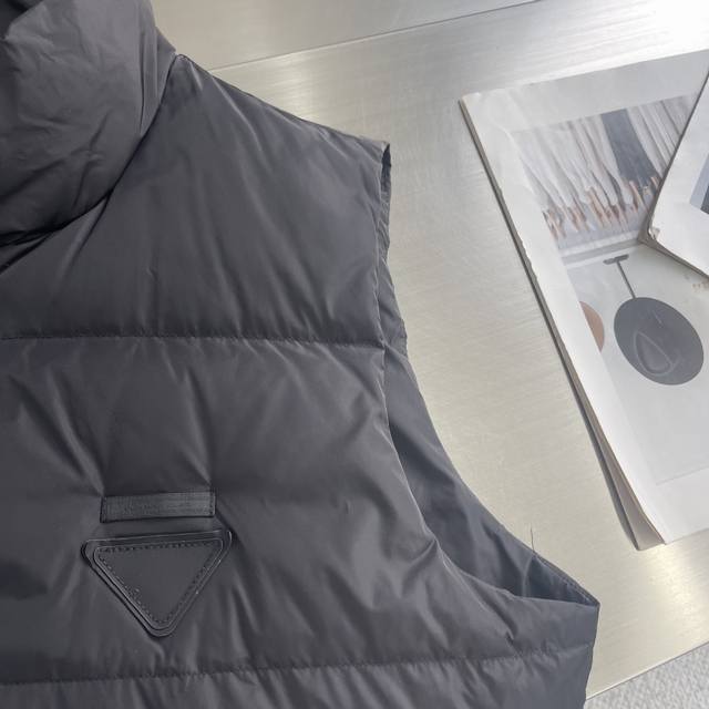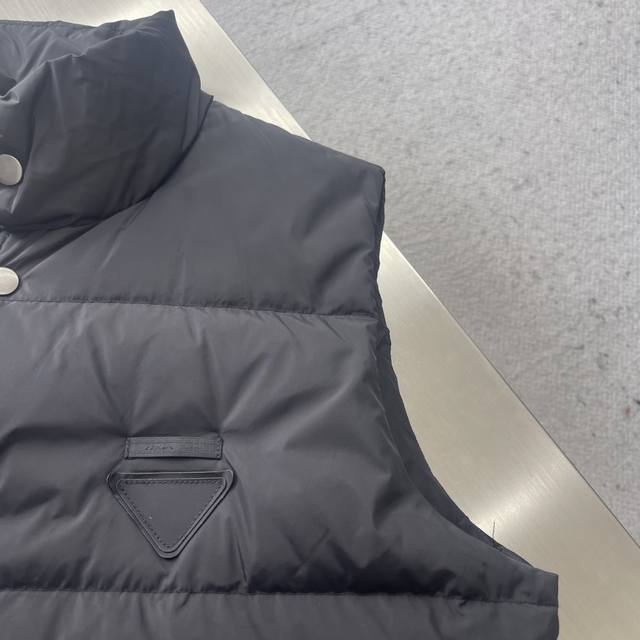 prad 25 Autumn/Winter New Black Label Inverted Triangle Logo Down Vest Ddd Custom Yb Windproof and Waterproof Nylon Material White Goose Down Filling Lining Lightweight and Warm Snap Button Flap Pockets Vest Fit Adjustable Fit Classic Rectangular Check Embossed Stand Collar Design Windproof and Warm The iconic triangle embroidery on the chest serves as decoration, embodying the brand concept of combining warmth and style, getting rid of the traditional bulky look. The first choice for layering in autumn and winter. Customized Fabrics and Accessories, Look for the Version Down Filling Standard: National Standard 90% Down Filling Material: White Goose Down DDD Sizes : M-XL Ddd Flz DDD