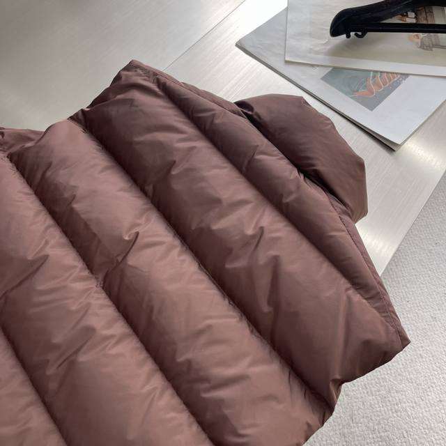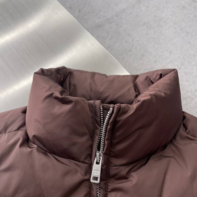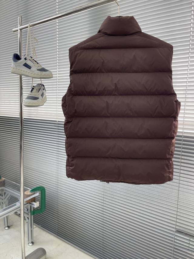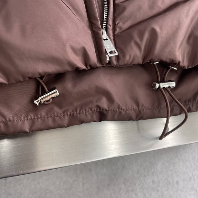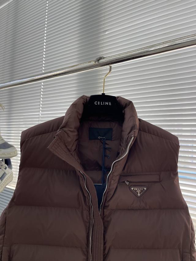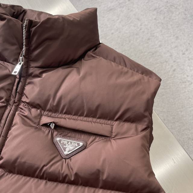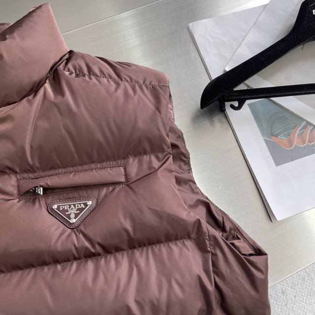 prad 25Fw New Quilted Triangle Logo Vest. This Re-Nylon vest features classic lines, a versatile style, and exudes sporty charm. It's adorned with an enamel metal triangle logo. Features include a stand-up collar with a zip closure, inlaid zip pockets, and an elastic hem. The design is very unique and stylish, and it looks amazing on. Extremely versatile! Sizes: 46 48 50 52 Length