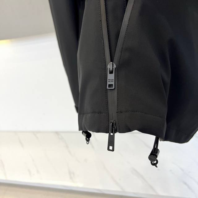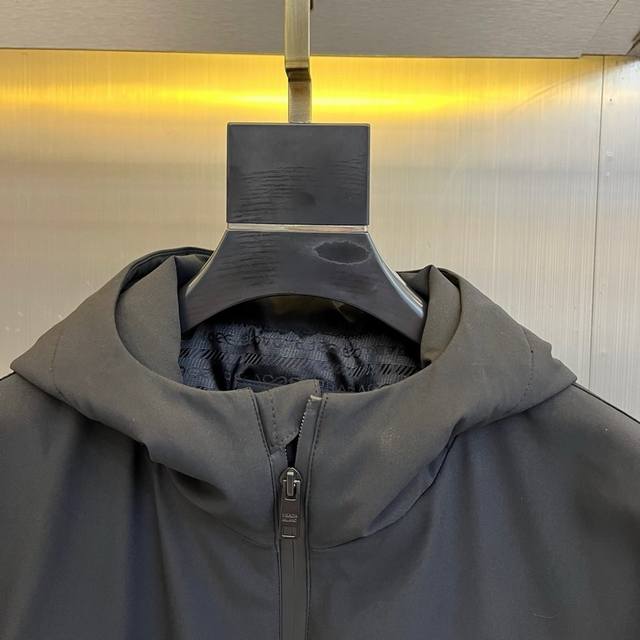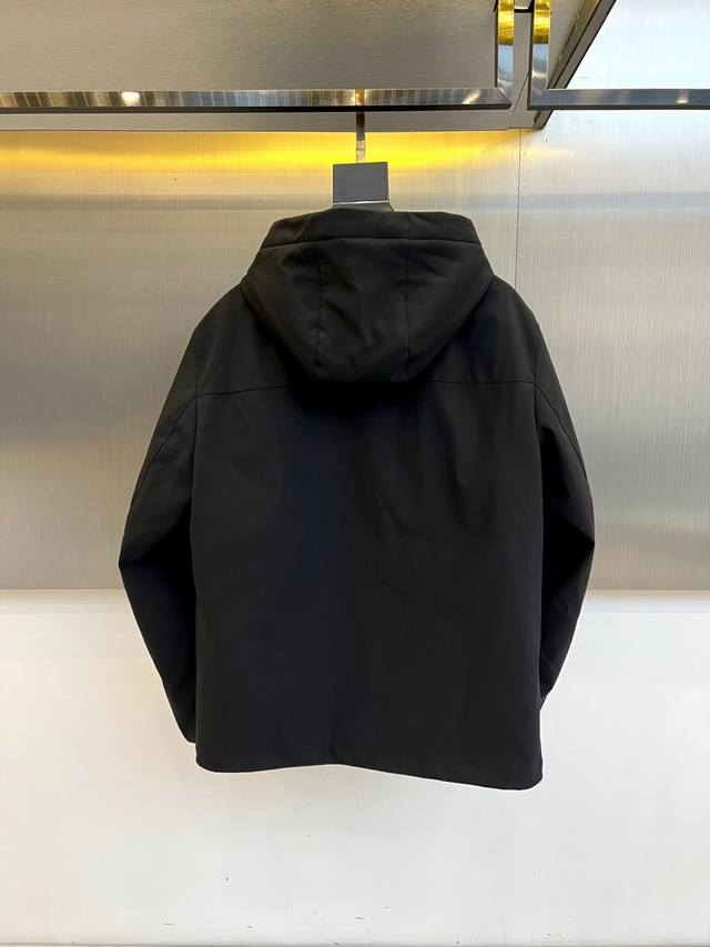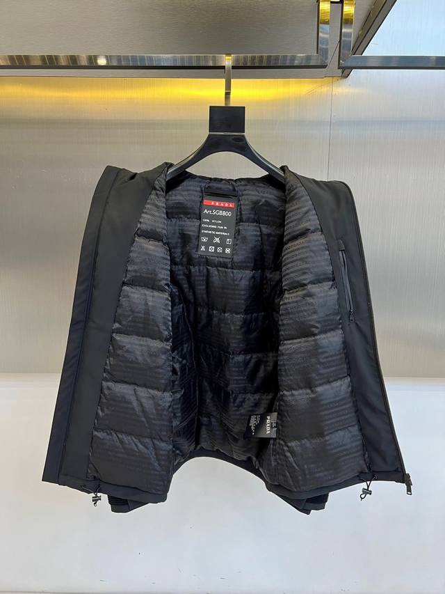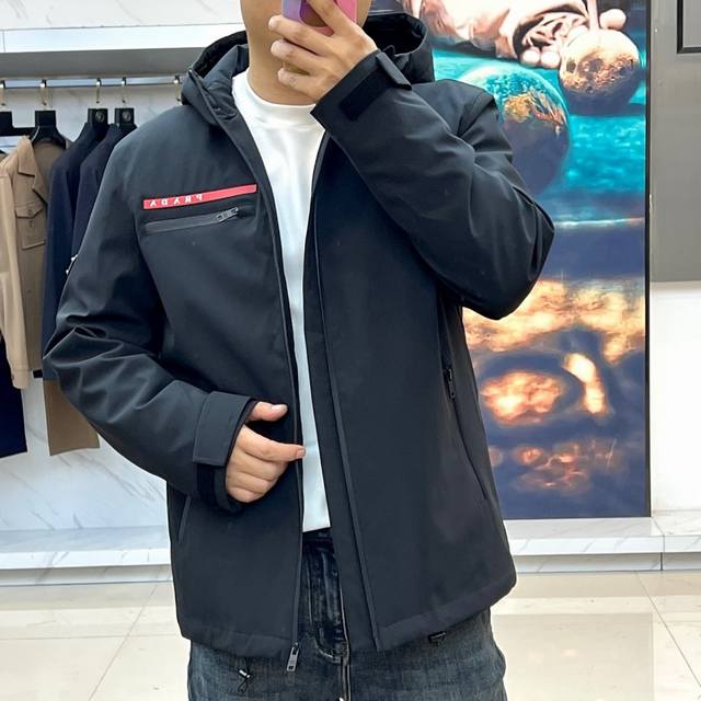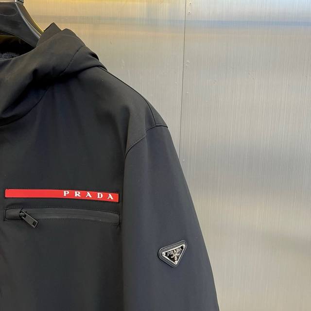 Prad Goose Down Jacket, 2025 Autumn/Winter New Arrival. Featuring classic black as its main color, this jacket exudes understated luxury. The hooded design balances casualness and practicality, easily handling unpredictable weather. A zipper closure makes it easy to put on and take off; a zippered pocket on the left chest cleverly blends decoration and function. The iconic red and white Prad logo adorns the chest, creating a striking visual highlight and ensuring high brand recognition. The triangular metal logo on the cuffs is refined and elegant, silently conveying the brand's DNA. The overall cut is clean and streamlined, ensuring warmth without sacrificing a stylish silhouette. Filled with premium goose down, it provides a lightweight and warm wearing experience. Its style perfectly balances high-fashion sophistication with everyday wearability, adding a touch of luxury to any outfit, whether paired with formal urban commuting or casual outings. It's an essential item for the cold season, offering both warmth and style. Model 48-56, 173cm tall, 143kg, size 50 (Ddd Fgt DDD)