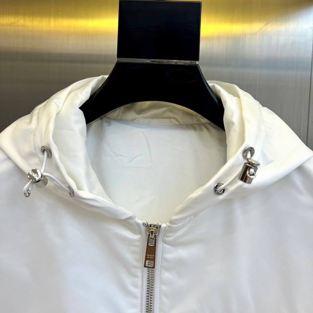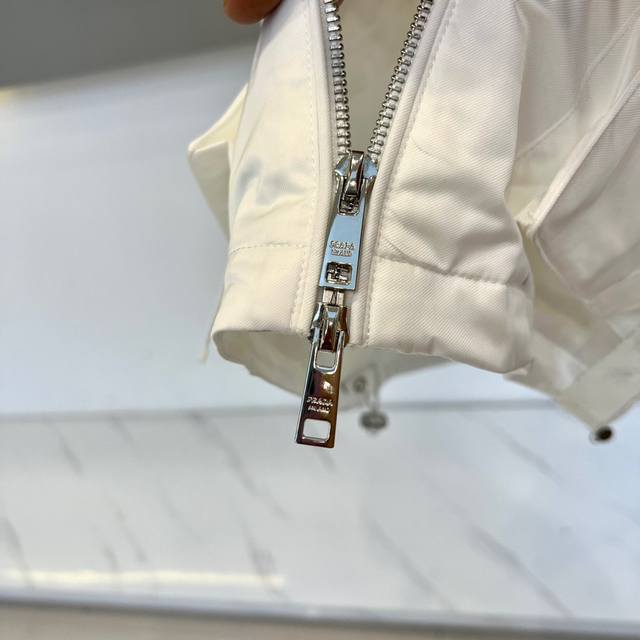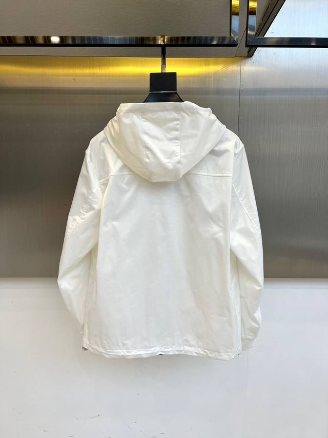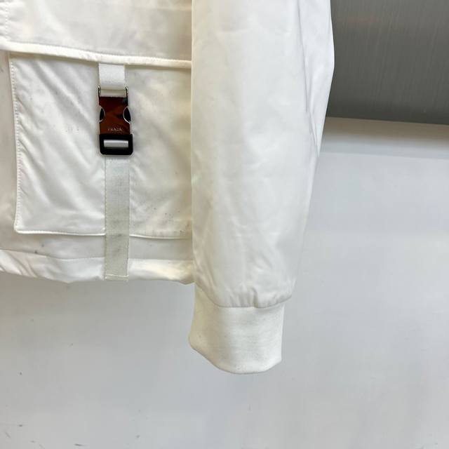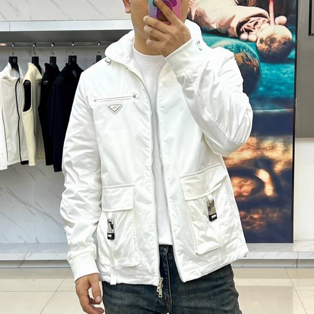 prad Prada, 25S new autumn and winter hooded jacket, unlocks modern industrial aesthetics with minimalist badges, and the classic triangle badge becomes a silent declaration. This Prada men's hooded jacket is made of high-density cotton fabric to create a crisp silhouette. The iconic triangular metal logo on the left chest is engraved with the word "Prada", announcing the brand's genes in the cold silver light. The full zipper opens and closes as smoothly as a blade, and the double side pockets are equipped with adjustable webbing and metal fasteners, combining practical functions with structural beauty. The metal buckles embedded in the edge of the hood design echo the rationality and tension of the industrial background. 48-56 Model is 173cm tall and weighs 143 pounds, wearing size 50