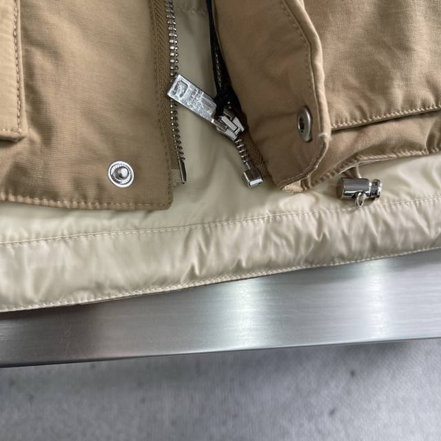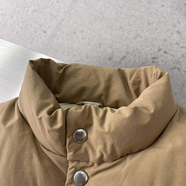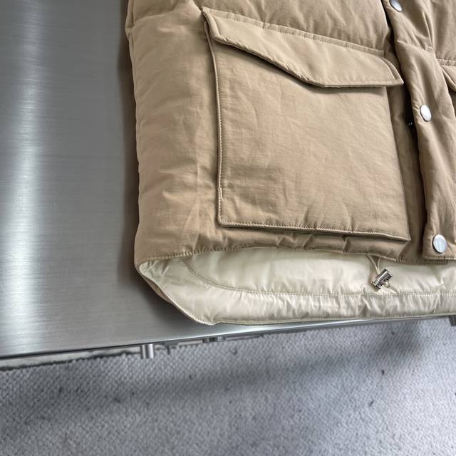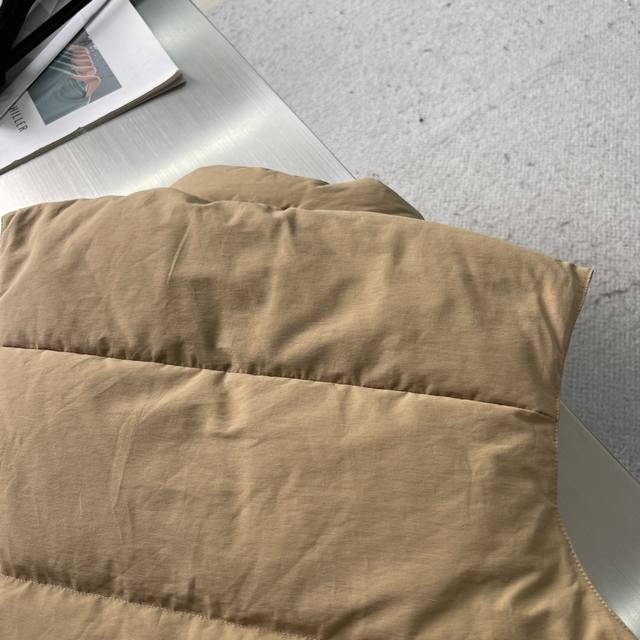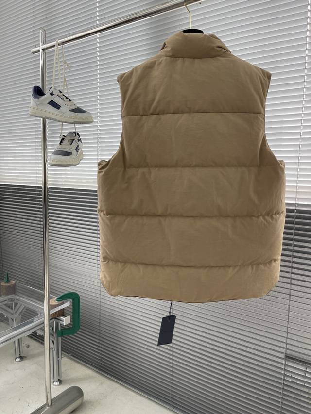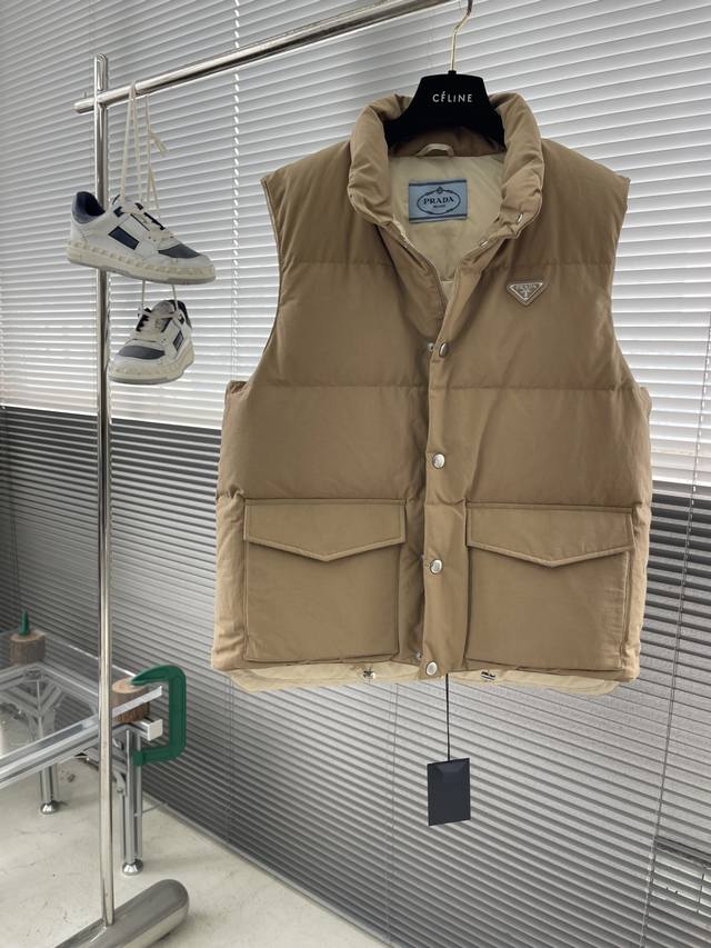 prad Triangular Logo Down Vest DDD When Italian aesthetics meet modern sportswear, this PD fabric vest becomes an indispensable high-end item in your wardrobe. Its simple silhouette carries exceptional quality, with a stand-up collar and a metallic triangular logo detail that complement each other, subtly revealing the brand's unique luxurious DNA. DDD The fabric is a blend of 55% cotton and 45% recycled nylon, combining natural texture with environmental protection principles. The delicate, skin-friendly lining is suitable for extended wear. DDD It is filled with 90% new national standard white duck down, providing warmth without bulk. Two flap pockets combine practicality and style, while the zipper and snap closures offer greater freedom of movement. The elastic drawstring at the hem cleverly cinches the waist, outlining a sleek silhouette. Whether paired with a shirt for a business casual look or combined with a sweatshirt for a street style vibe, it's versatile. DDD The lined interior is soft and comfortable against the skin, and the metallic logo adds a touch of starlight in the dark. From city commutes to weekend hikes, it embodies both functionalism and a style statement. Sizes: S, M, L, XL.