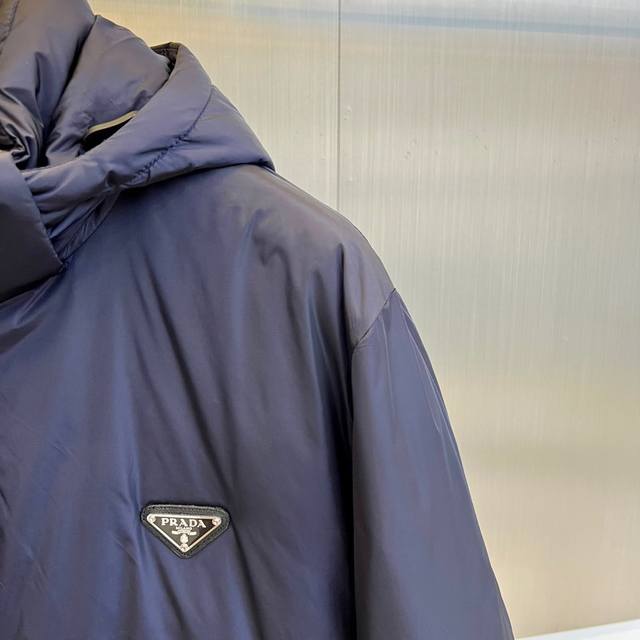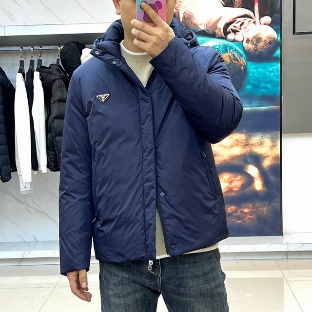 Prada, 2025 Fall/Winter New Arrival: Prada Diamond Quilted Down Jacket. The black stand-up collar features a precision zipper system, while the three-dimensional diamond quilting outlines a geometric silhouette, effectively securing the down and preventing shifting. A signature triangular metal logo adorns the left chest, and adjustable buttons on the cuffs enhance wind resistance. Both the outer and lining are made of 100% nylon, lightweight, durable, and windproof. Filled with 90% white duck down, the 93g fill weight balances warmth and lightness. Meeting GB T14272- down standards and Class C safety certification, it is precisely designed for Asian body types. The diamond quilting enhances visual appeal and optimizes warmth distribution, allowing for a business casual look when paired with dress trousers or for a more relaxed urban style. From the metal badge to the functional details, this jacket embodies Prada's design philosophy of blending Italian aesthetics with practical technology. Model 48-56, 173cm tall, 143kg, size 50 (Ddd Fgt DDD)