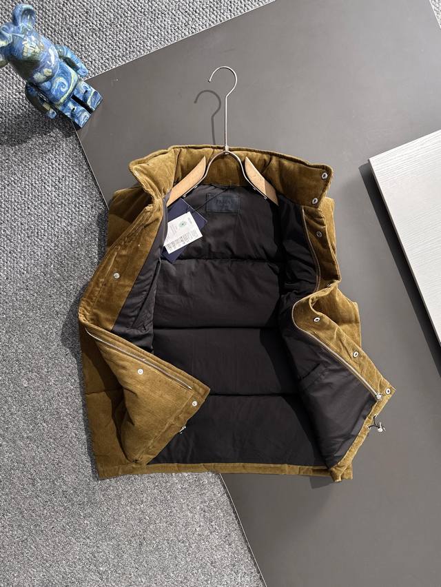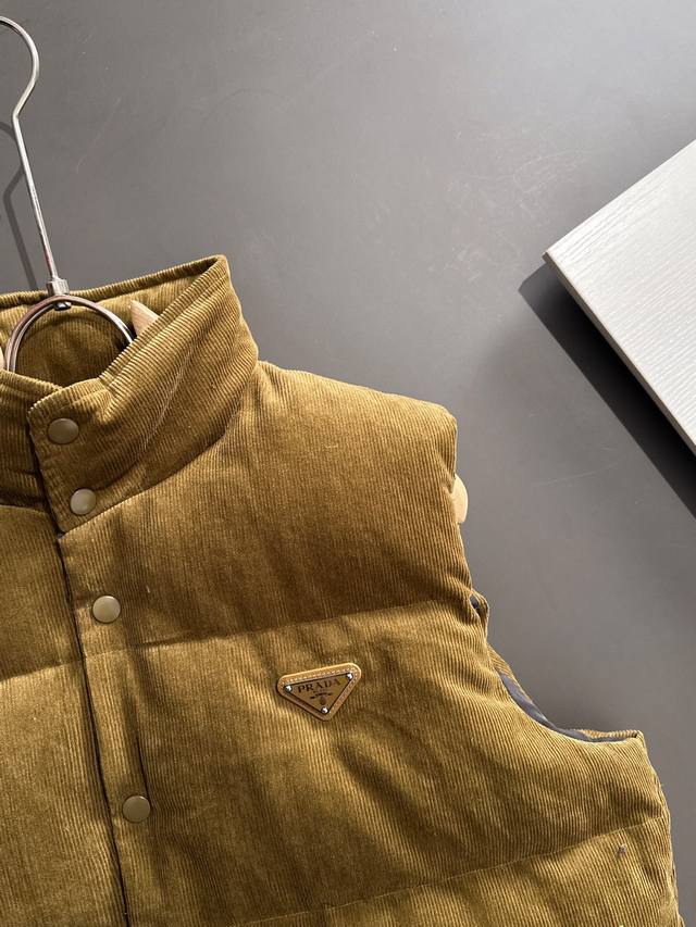 prada 25Fw This Prada vest features a triangular logo made of genuine leather. The hardware, including the Prada logo lettering, has a smooth, non-rough finish, just like the original. It has three interior pockets and a concealed hood at the back of the collar. All details are identical to the original. Comes with a dedicated dust bag. Please look for the details if you are buying a high-quality version. New autumn/winter corduroy stand-collar warm down vest! A classic unisex triangular logo vest. The corduroy fabric is incredibly soft and will definitely be a highlight of your autumn/winter outfits. A must-have for both men and women in autumn/winter fashion. This timeless classic is a safe bet for trendy men and women, perfect for everyday wear! This down vest is made from 100% custom-woven corduroy. The fabric features a textured, warm ribbed detail, giving it a retro, vintage feel, reminiscent of the 70s, and a relaxed, laid-back vibe! The inner lining is made of fine, smooth fibers, filled with 90% white goose down. The down is plentiful, without any clumps or stems, providing a full and soft texture. It instantly springs back when pressed, effectively locking in warmth and providing the ultimate in comfort! The basic, classic stand-up collar vest design is simple and clean, easily creating a stylish and sophisticated casual look! Sizes: S-XL